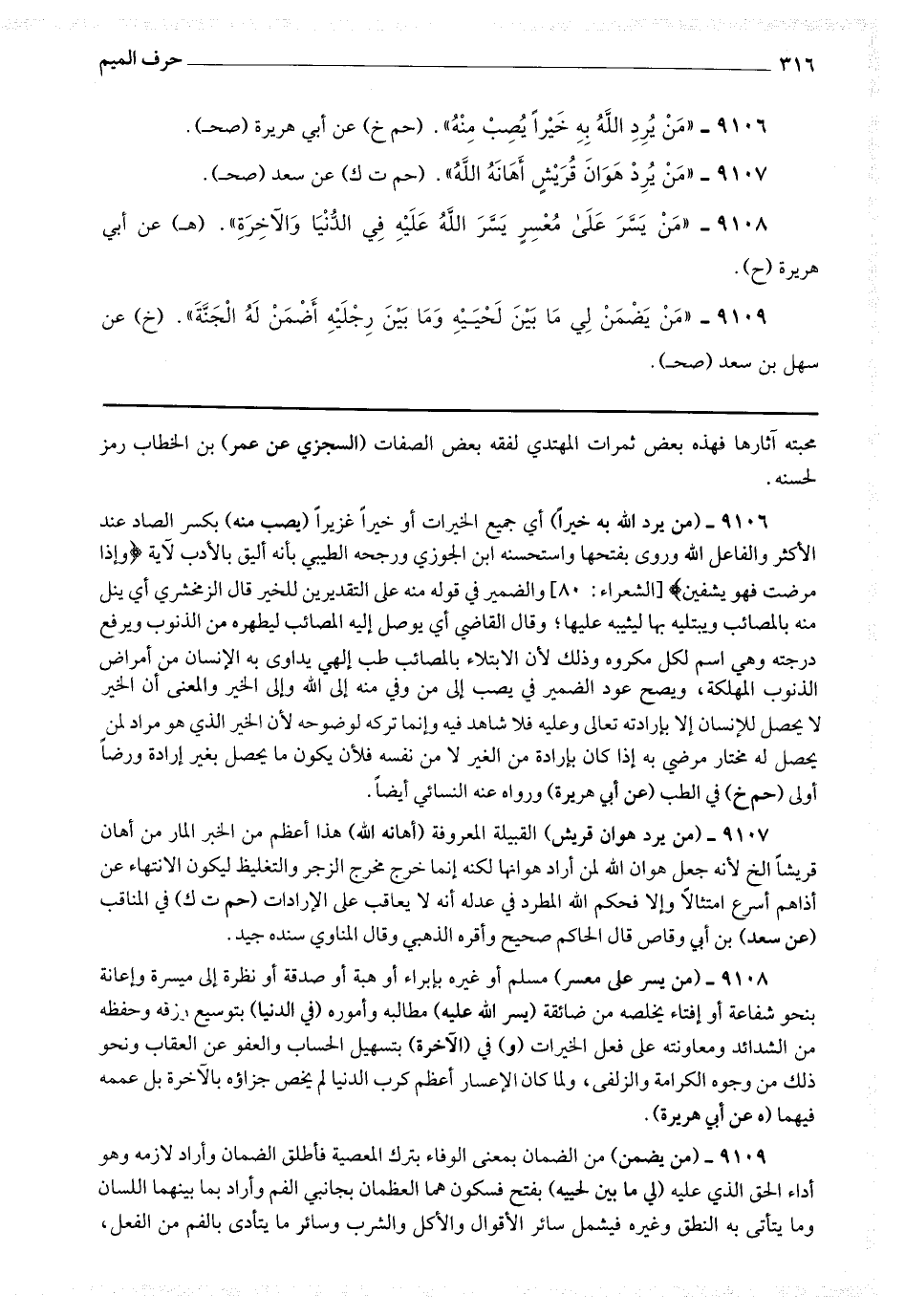 9109 - (من يضمن) من الضمان بمعنى الوفاء بترك المعصية فأطلق الضمان وأراد لازمه وهو أداء الحق الذي عليه (لي ما بين لحييه) بفتح فسكون هما العظمان بجانبي الفم وأراد بما بينهما اللسان وما يتأتى به النطق وغيره فيشمل سائر الأقوال والأكل والشرب وسائر ما يتأدى بالفم من الفعل ،