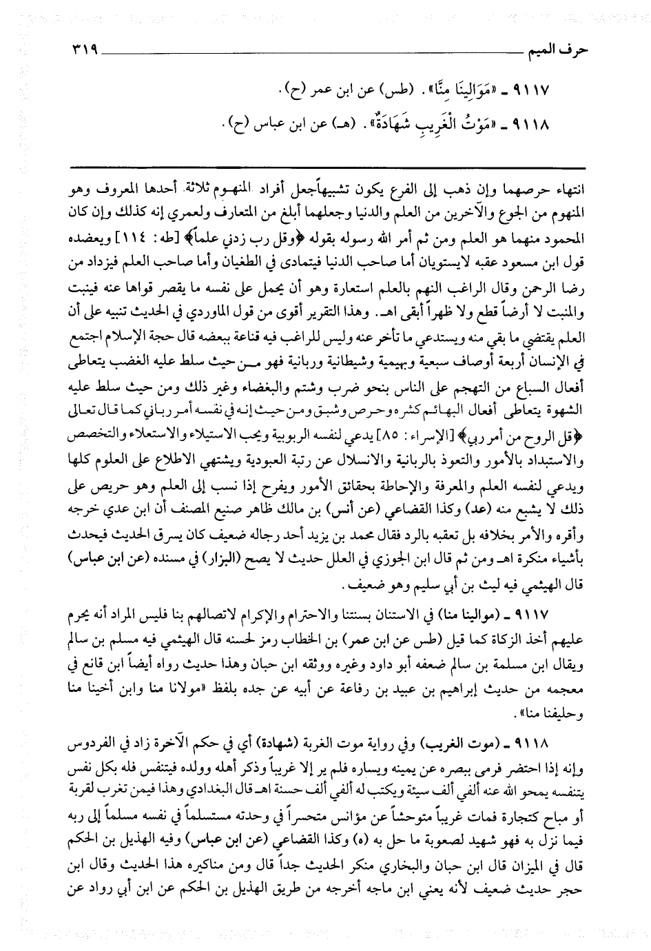 انتهاء حرصهما وإن ذهب إلى الفرع يكون تشبيها ، جعل أفراد المنهوم ثلاثة أحدها المعروف وهو المنهوم من الجوع والآخرين من العلم والدنيا وجعلهما أبلغ من المتعارف ، ولعمري إنه كذلك وإن كان المحمود منهما هو العلم ومن ثم أمر الله رسوله بقوله * (وقل رب ذدني علما) * ويعضده قول ابن مسعود عقبه لا يستويان أما صاحب الدنيا فيتمادى في الطغيان وأما صاحب العلم فيزداد من رضا الرحمن ، وقال الراغب : النهم بالعلم استعارة وهو أن يحمل على نفسه ما يقصر قواها عنه فينبت والمنبت لا أرضا قطع ولا ظهرا أبقى اه.