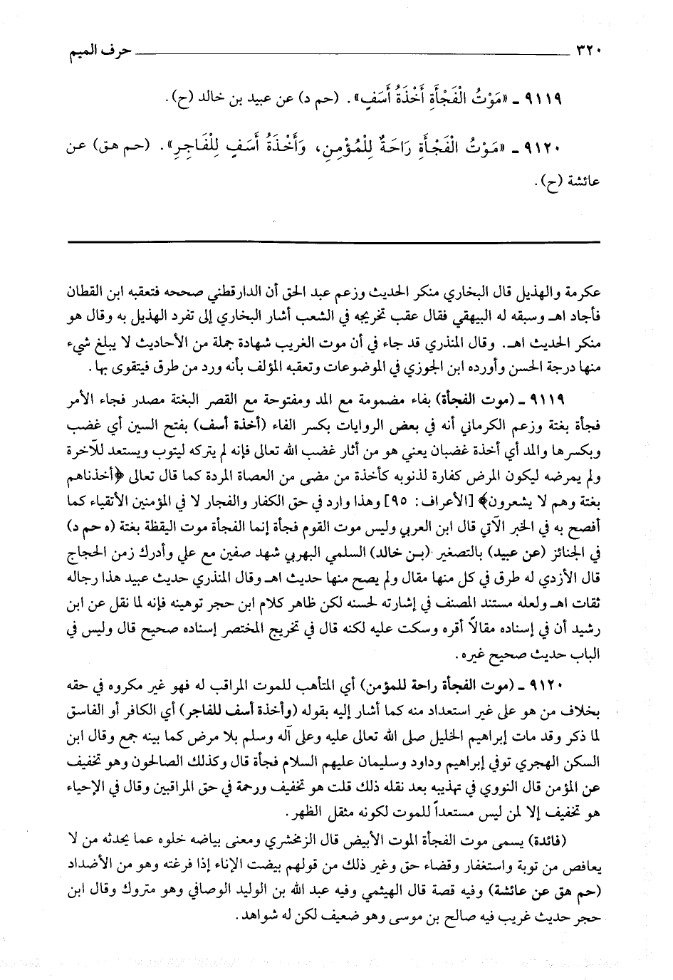 9120 - (موت الفجأة راحة للمؤمن) أي المتأهب للموت المراقب له فهو غير مكروه في حقه بخلاف من هو على غير استعداد منه كما أشار إليه بقوله (وأخذة أسف للفاجر) أي الكافر أو الفاسق لما ذكر وقد مات إبراهيم الخليل صلى الله تعالى عليه وعلى آله وسلم بلا مرض كما بينه جمع وقال ابن السكن الهجري توفي إبراهيم وداود وسليمان عليهم السلام فجأة قال : وكذلك الصالحون وهو تخفيف عن المؤمن قال النووي في تهذيبه بعد نقله ذلك : قلت هو تخفيف ورحمة في حق المراقبين وقال في الإحياء : وهو تخفيف إلا لمن ليس مستعدا للموت لكونه مثقل الظهر (فائدة) يسمى موت الفجأة الموت الأبيض قال الزمخشري : ومعنى بياضه خلوه عما يحدثه من لا يعافص من توبة واستغفار وقضاء حق وغير ذلك من قولهم بيضت الإناء إذا فرغته وهو من الأضداد.