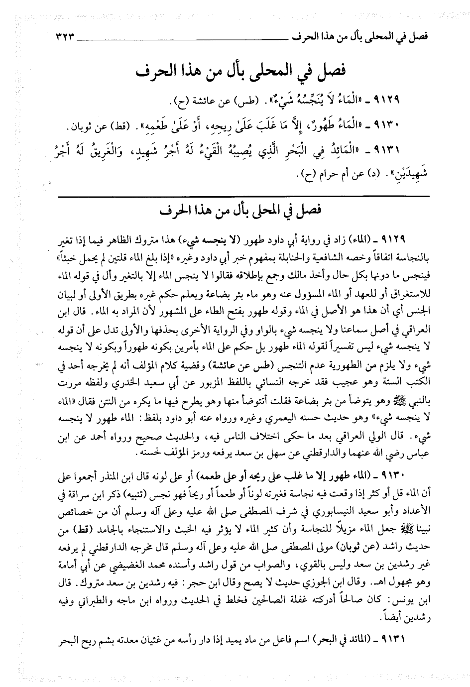 9130 - (الماء طهور إلا ما غلب على ريحه أو على طعمه) أو على لونه قال ابن المنذر: أجمعوا على أن الماء قل أو كثر إذا وقعت فيه نجاسة فغيرته لونا أو طعما أو ريحا فهو نجس (تنبيه) ذكر ابن سراقة في الأعداد وأبو سعيد النيسابوري في شرف المصطفى صلى الله تعالى عليه وعلى آله وسلم أن من خصائص نبينا صلى الله عليه وسلم جعل الماء مزيلا للنجاسة وأن كثير الماء لا يؤثر فيه الخبث والاستنجاء بالجامد (قط) من حديث راشد (عن ثوبان) مولى المصطفى صلى الله عليه وعلى آله وسلم قال مخرجه الدارقطني: لم يرفعه غير رشدين بن سعد وليس بالقوي، والصواب من قول راشد، [ص 249] وأسنده محمد الغضيضي عن أبي أمامة وهو مجهول اه.