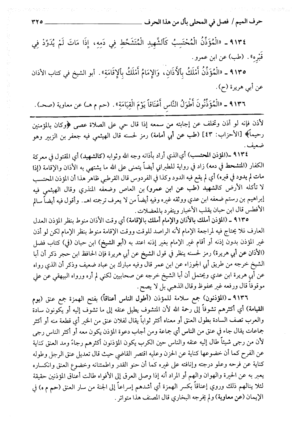 9136 - (المؤذنون) جمع سلامة للمؤذن (أطول الناس أعناقا) بفتح الهمزة جمع عنق (يوم القيامة) أي أكثرهم تشوفا إلى رحمة الله لأن المتشوف يطيل عنقه إلى ما تشوف إليه أو يكونون سادة والعرب تصف السادة بطول العنق أو معناه أكثر ثوابا يقال لفلان عنق من الخير أي قطعة منه أو أكثر جماعات يقال جاء في عنق من الناس أي جماعة ومن أجاب دعوة المؤذن يكون معه أو أكثر الناس رجى لأن من رجى شيئا طال إليه عنقه والناس حين الكرب يكون المؤذنون أكثرهم رجاءا ومد العنق كناية عن الفرح كما أن خضوعها كناية عن الحزن وعليه اقتصر القاضي حيث قال : تعديل عنق الرجل وطوله كناية عن فرحه وعلو درجته وإناقته على غيره كما أن حنو القدر واطمئنانه وخضوع العنق وانكساره يعبر به عن الحيرة والهوان والهم ، أو المراد أنه إذا وصل العرق إلى الأفواه طالت أعناق المؤذنين حقيقة لئلا ينالهم ذلك وروي إعناقا بكسر الهمزة أي أشدهم إسراعا إلى الجنة من سار العنق (حم م ه) في الإيمان (عن معاوية) ولم يخرجه البخاري قال المصنف : هذا متواتر.