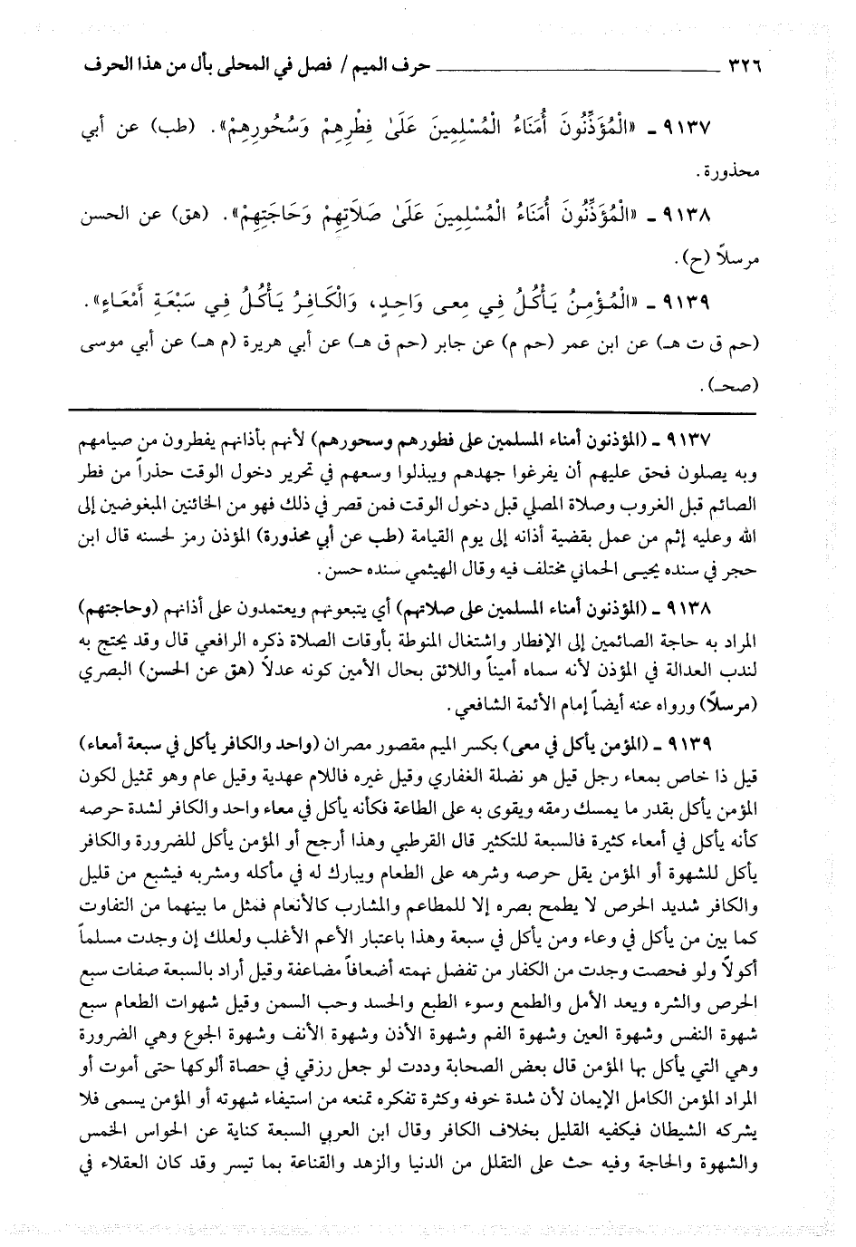 9138 - (المؤذنون أمناء المسلمين على صلاتهم) أي يتبعونهم ويعتمدون على أذانهم (وحاجتهم) المراد به حاجة الصائمين إلى الإفطار واشتغال المنوطة بأوقات الصلاة ذكره الرابعي قال : وقد يحتج به لندب العدالة في المؤذن لأنه سماه أمينا واللائق بحال الأمين كونه عدلا (هق عن الحسن) البصري (مرسلا) ورواه عنه أيضا إمام الأئمة الشافعي.