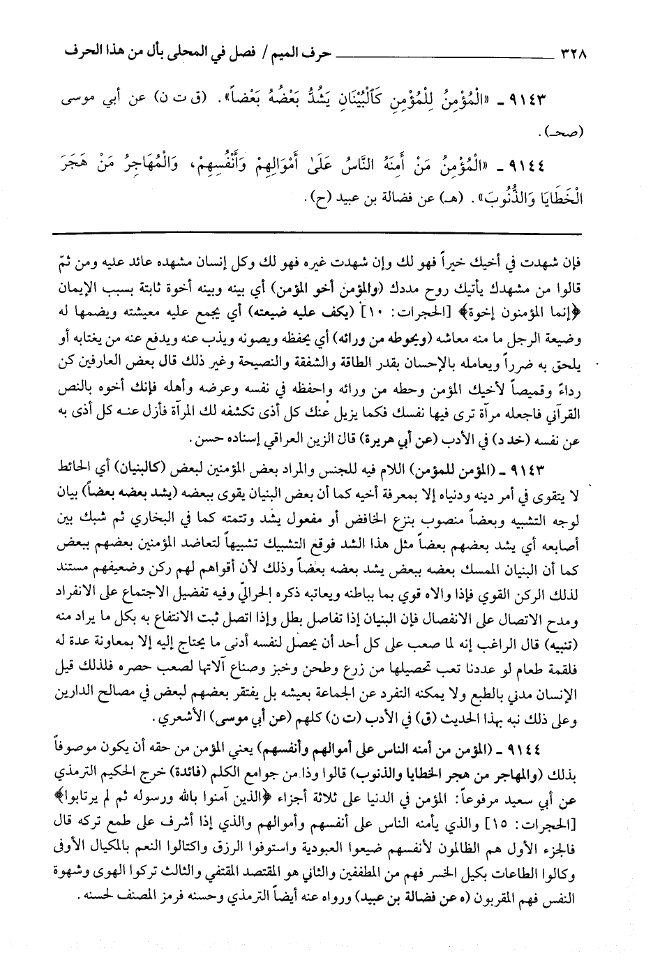 9143 - (المؤمن للمؤمن) اللام فيه للجنس والمراد بعض المؤمنين لبعض (كالبنيان) أي الحائط لا يتقوى في أمر دينه ودنياه إبمعرفة أخيه كما أن بعض البنيان يقوى ببعضه (يشد بعضه بعضا) بيان لوجه التشبيه وبعضا منصوب بنزع الخافض أو مفعول يشد وتتمته كما في البخاري ثم شبك بين أصابعه أي يشد بعضهم بعضا مثل هذا الشد فوقع التشبيك تشبيها لتعاضد المؤمنين بعضهم ببعض كما أن البنيان الممسك بعضه ببعض يشد بعضه بعضا وذلك لأن أقواهم لهم ركن وضعيفهم مستند لذلك الركن القوي فإذا والاه قوي بما بباطنه ويعاتبه ذكره الحرالي ، وفيه تفضيل الاجتماع على الانفراد ومدح الاتصال على الانفصال فإن البنيان إذا تفاصل بطل وإذا اتصل ثبت الانتفاع به بكل ما يراد منه.