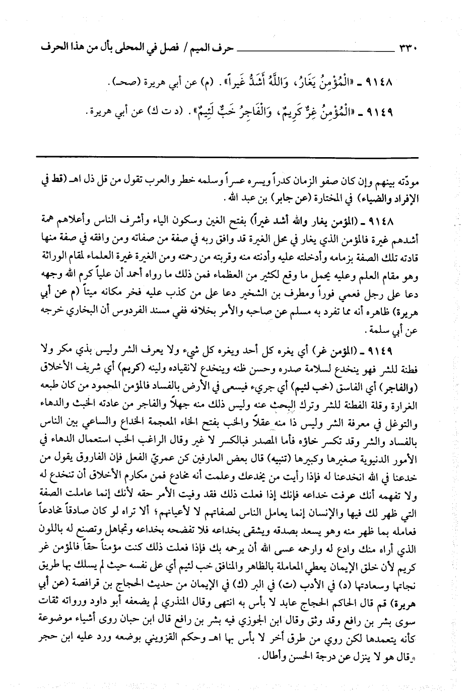 9148 - (المؤمن يغار والله أشد غيرا) بفتح الغين وسكون الياء وأشرف الناس وأعلاهم همة أشدهم غيرة فالمؤمن الذي يغار في محل الغيرة قد وافق ربه في صفة من صفاته ومن وافقه في صفة منها قادته تلك الصفة بزمامه وأدخلته عليه وأدنته منه وقربته من رحمته ومن الغيرة غيره العلماء لمقام الوراثة وهو مقام العلم وعليه يحمل ما وقع لكثير من العظماء فمن ذلك ما رواه [ ص 254 ] أحمد أن عليا كرم الله وجهه دعا على رجل فعمي فورا ومطرف بن الشخير دعا على من كذب عليه فخر مكانه ميتا - (م عن أبي هريرة) ظاهره أنه مما تفرد به مسلم عن صاحبه والأمر بخلافه ففي مسند الفردوس أن البخاري خرجه عن أبي سلمة.
