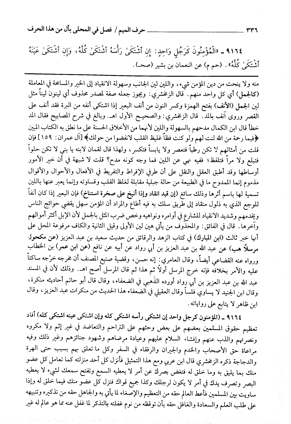 9164 - (المؤمنون كرجل واحد إن اشتكى رأسه اشتكى كله وإن اشتكى عينه اشتكى كله) أفاد تعظيم حقوق المسلمين بعضهم على بعض وحثهم على التراحم والتعاضد في غير إثم ولا مكروه ونصرتهم والذب عنهم وإفشاء السلام عليهم وعيادة مرضاهم وشهود جنائزهم وغير ذلك ، وفيه مراعاة حق الأصحاب والخدم والجيران والرفقاء في السفر وكل ما تعلق بهم بسبب حتى الهرة والدجاجة ذكره الزمخشري قال ابن عربي : ومع هذا التمثيل فأنزل كل أحد منزلته كما تعامل كل عضو منك بما يليق به وما خلق له فتغض بصرك عن أمر لا يعطيه السمع وتفتح سمعك لشئ لا يعطيه البصر وتصرف يدك في أمر لا يكون لرجلك وكذا جميع قواك فنزل كل عضو منك فيما خلق له وإذا ساويت بين المسلمين فأعط العالم حقه من التعظيم والإصغاء لما يأتي به والجاهل حقه من نذكيره وتنبيهه
