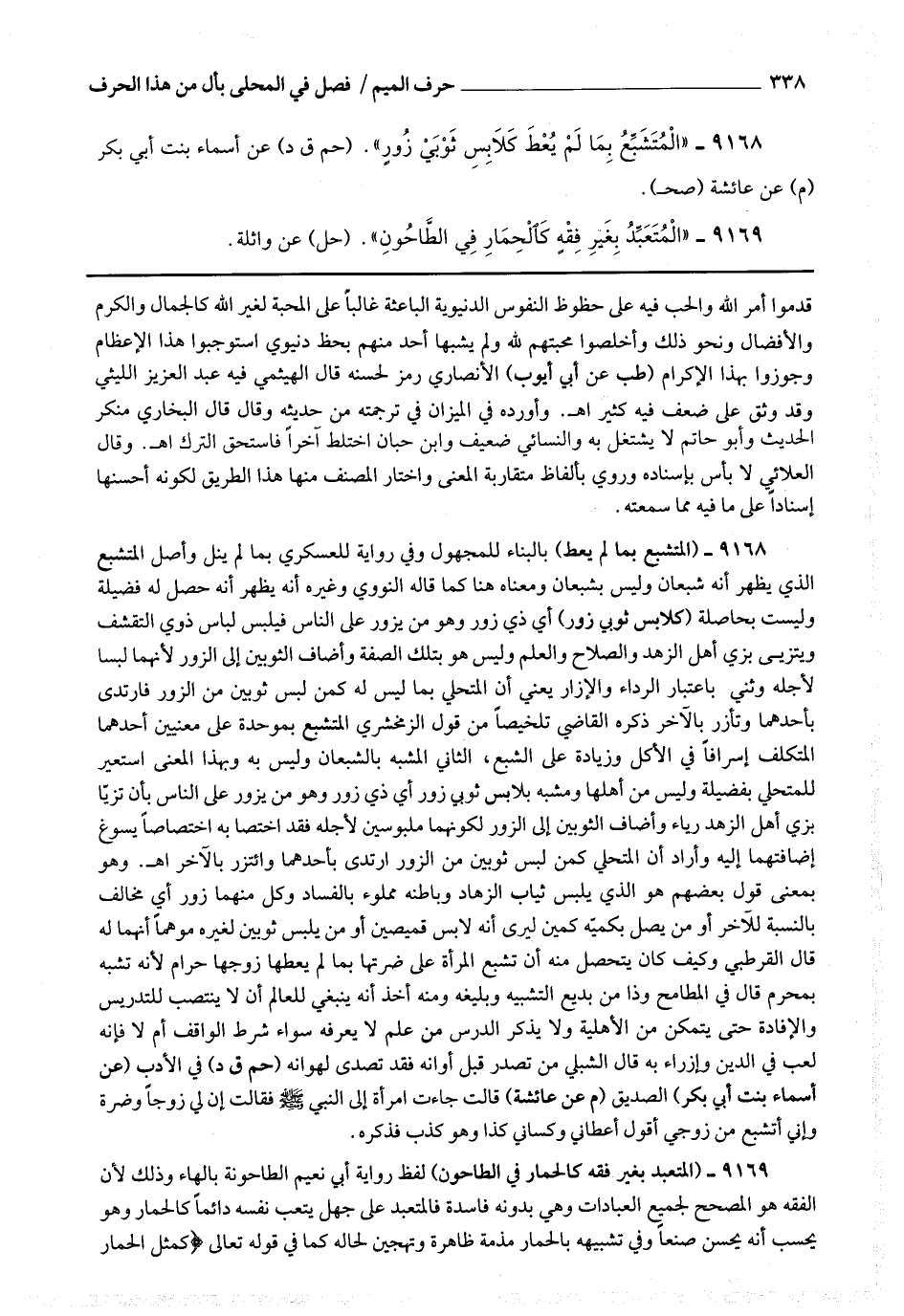 9169 - (المتعبد بغير فقه كالحمار في الطاحون) لفظ رواية أبي نعيم الطاحونة وذلك لأن الفقه هو المصحح لجميع العبادات وهي بدونه فاسدة فالمتعبد على جهل يتعب نفسه دائما كالحمار وهو يحسب أنه يحسن صنعا وفي تشبيهه بالحمار مذمة ظاهرة وتهجين لحاله كما في قوله * (كمثل الحمار