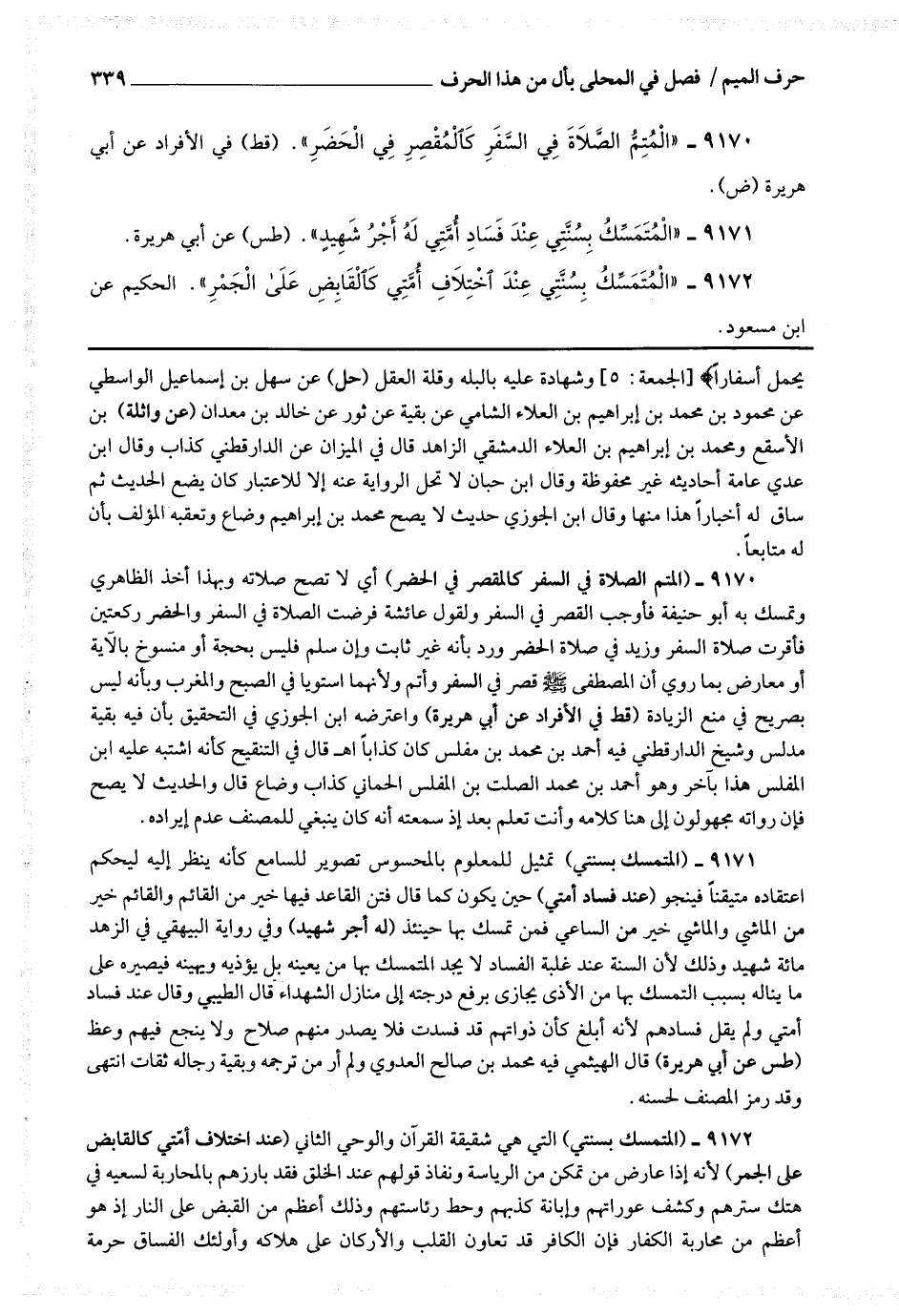 يحمل أسفارا) * وشهادة عليه بالبله وقلة العقل (حل) عن سهل بن إسماعلي الواسطي عن محمود بن محمد بن إبراهيم بن العلاء الشامي عن بقية عن ثور عن خالد بن معدان (عن واثلة) بن الأسقع ومحمد بن إبراهيم بن العلاء الدمشقي الزاهد قال في الميزان عن الدارقطني : كذاب وقال ابن عدي : عامة أحاديثه غير محفوظة وقال ابن حبان : لا تحل الرواية عنه إلا للاعتبار كان يضع الحديث ثم ساق له أخبارا هذا منها وقال ابن الجوزي : حديث لا يصح محمد بن إبراهيم وضاع وتعقبه المولف بأن له متابعا.