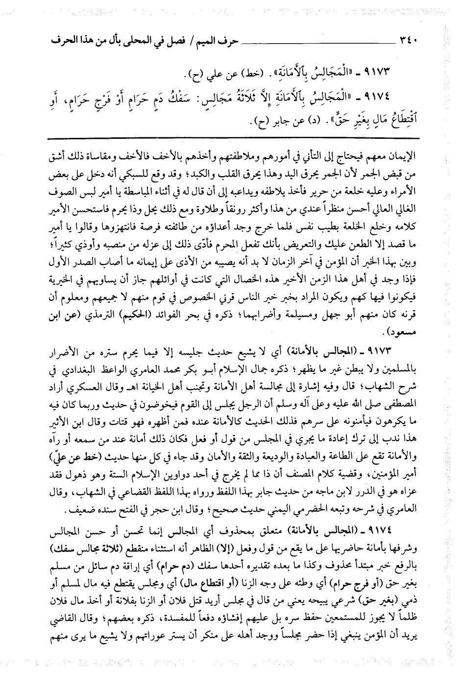 9174 - (المجالس بالأمانة) متعلق بمحذوف أي المجالس إنما تحسن أو حسن المجالس وشرفها بأمانة حاضريها على ما يقع من قول وفعل (إلا) الظاهر أنه استثناء منقطع (ثلاثة مجالس سفك) بالرفع خبر مبتدأ محذوف وكذا ما بعده تقديره أحدها سفك (دم حرام) أي إراقة دم سائل من مسلم بغير حق (أو فرج حرام) أي وطئه على وجه الزنا (أو اقتطاع مال) أي ومجلس يقتطع فيه مال لمسلم أو