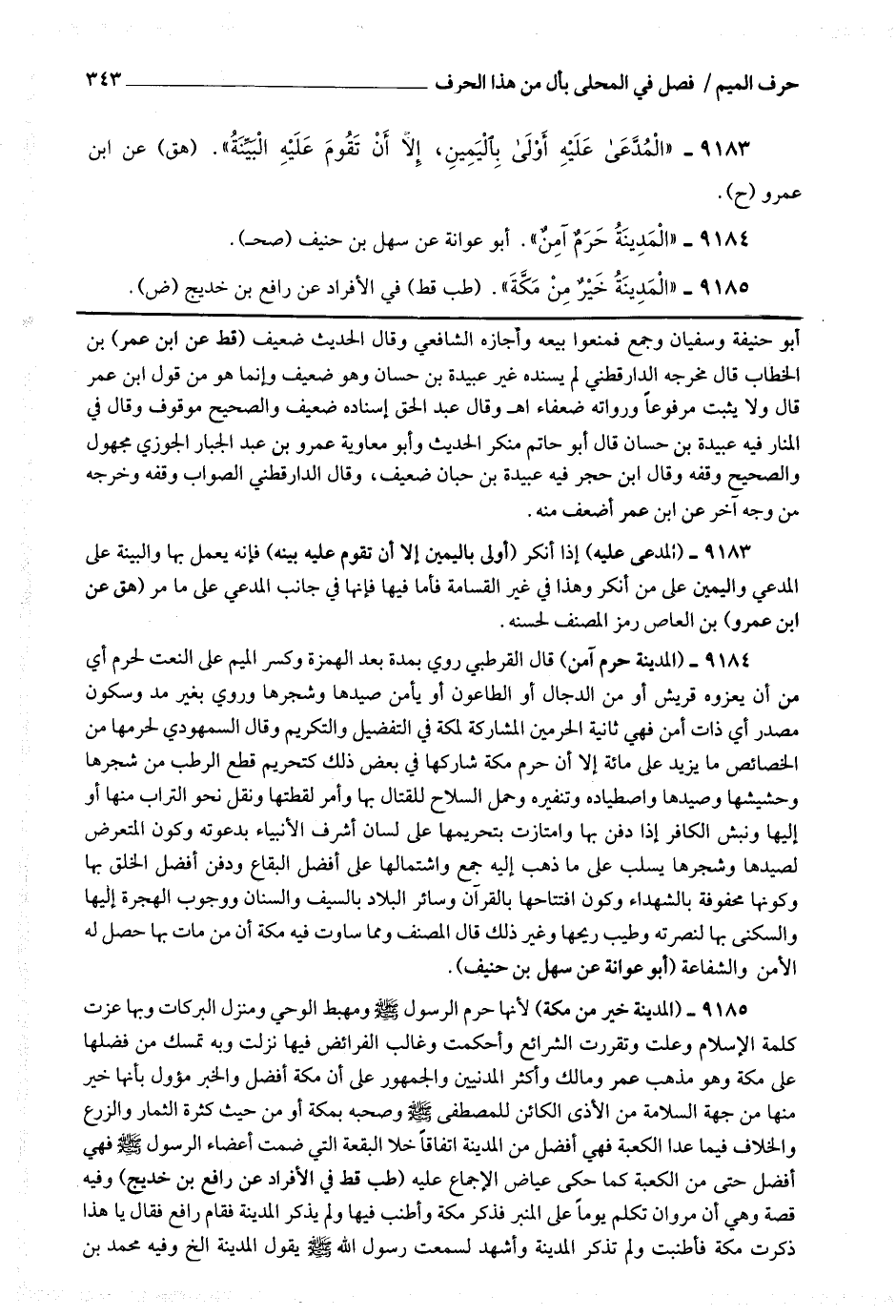 9185 - (المدينة خير من مكة) لأنها حرم الرسول صلى الله عليه وسلم ومهبط الوحي ومنزل البركات وبها عزت كلمة الإسلام وعلت وتقررت الشرائع وأحكمت وغالب الفرائض فيها نزلت وبه تمسك من فضلها على مكة وهو مذهب عمر ومالك وأكثر المدنيين والجمهور على أن مكة أفضل والخبر مؤول بأنها خير منها من جهة السلامة من الأذى الكائن للمصطفى صلى الله عليه وسلم وصحبه بمكة أو من حيث كثرة الثمار والزرع والخلاف فيما عدا الكعبة فهي أفضل من المدينة اتفاقا خلا البقعة التي ضمت أعضاء الرسول صلى الله عليه وسلم فهي أفضل حتى من الكعبة كما حكى عياض الإجماع عليه (طب قط في الأفراد عن رافع بن خديج) وفيه قصة وهي أن مروان تكلم يوما على المنبر فذكر مكة وأطنب فيها ولم يذكر المدينة فقام رافع فقال : يا هذا ذكرت مكة فأطنبت ولم تذكر المدينة وأشهد لسمعت رسول الله صلى الله عليه وسلم يقول المدينة إلخ ، وفيه محمد بن