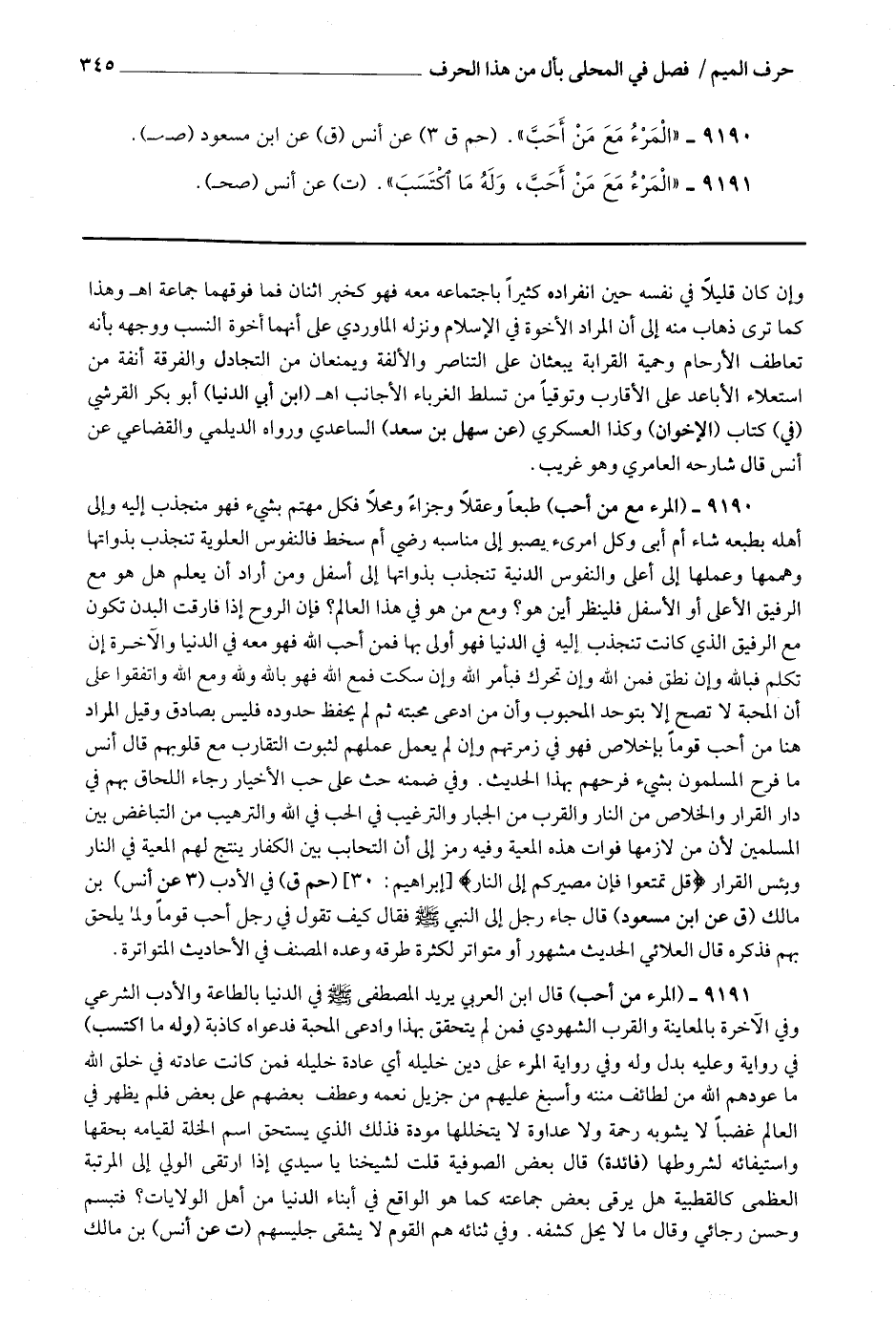 وفي ضمنه حث على حب الأخيار رجاء اللحاق بهم في دار القرار والخلاص من النار والقرب من الجبار والترغيب في الحب في الله والترهيب من التباغض بين المسلمين لأن من لازمها فوات هذه المعية وفيه رمز إلى أن التحابب بين الكفار ينتج لهم المعية في النار وبئس القرار * (قل تمتعوا فإن مصيركم إلى النار) * (حم ق) في الأدب (3 عن أنس) بن مالك (ق عن ابن مسعود) قال : جاء رجل إلى النبي صلى الله عليه وسلم فقال : كيف تقول في رجل أحب قوما ولما يلحق بهم فذكره قال العلائي : الحديث مشهور أو متواتر لكثرة طرقه ، وعده المصنف في الأحاديث المتواترة.