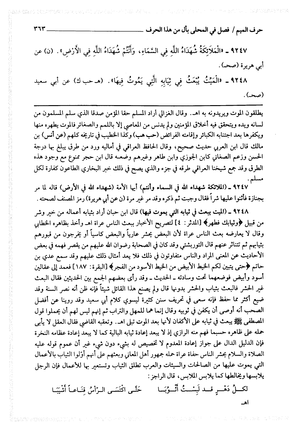 9248 - (الميت يبعث في ثيابه التي يموت فيها) قال ابن حبان : أراد بثيابه أعماله من خير وشر من قبيل * (وثيابك فطهر) * لتصريح الأخبار ببعث الناس عراة اه وأخذ بظاهره الخطابي