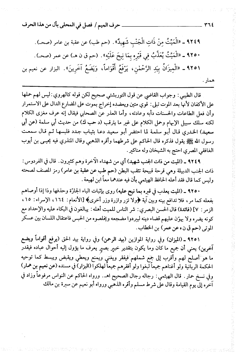 9250 - (الميت يعذب في قبره بما نيح عليه) روي بإثبات الباء الجارة وحذفها وذا إذا أوصاهم بفعله كما مر ، فلا ندافع بينه وبين آية * (ولا تزر وازرة وزر أخرى) *.