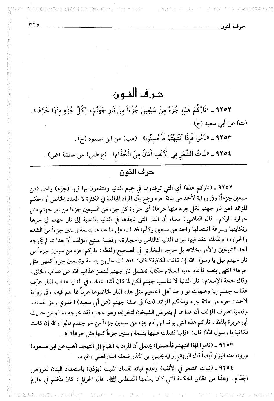 9252 - (ناركم هذه) أي التي توقدونها في جميع الدنيا وتنتفعون بها فيها (جزء) واحد (من سبعين جزءا) وفي رواية لأحمد من مائة جزء وجمع بأن المراد المبالغة في الكثرة لا العدد الخاص أو الحكم للزائد (من نار جهنم، لكل جزء منها [ص 281] حرها) أي حرارة كل جزء من السبعين جزءا من نار جهنم مثل حرارة ناركم.