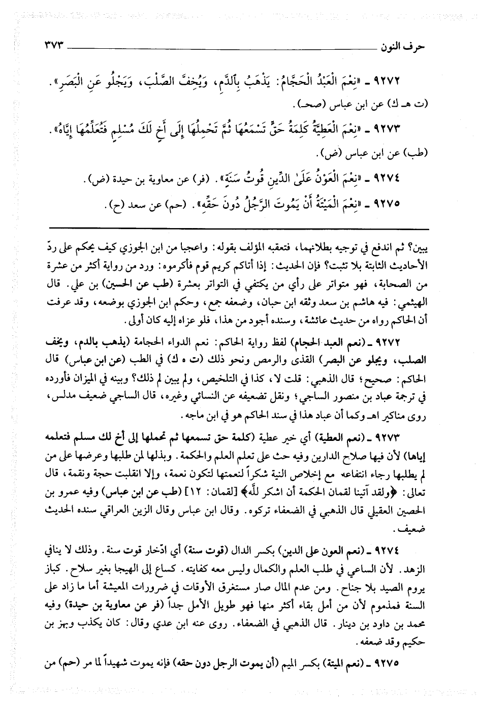 9272 - (نعم العبد الحجام) لفظ رواية الحاكم : نعم الدواء الحجامة (يذهب بالدم ، ويخف الصلب ، ويجلو عن البصر) القذى والرمص ونحو ذلك (ت ه ك) في الطب (عن ابن عباس) قال الحاكم : صحيح ، قال الذهبي : قلت لا ، كذا في التلخيص ، ولم يبين لم ذلك ؟ وبينه في الميزان فأورده في ترجمة عباد بن منصور الساجي ، ونقل تضعيفه عن النسائي وغيره ، قال الساجي ضعيف مدلس ، روى مناكير اه وكما أن عباد هذا في سند الحاكم هو في ابن ماجه.