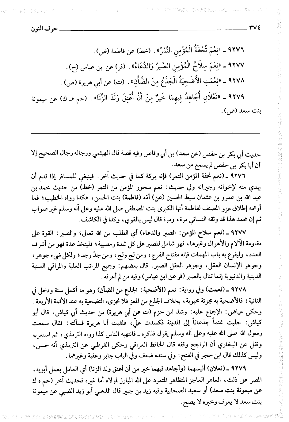 فينبغي للمسافر إذا قدم أن يهدي منه لإخوانه وجيرانه وفي حديث : نعم سحور المؤمن من التمر (خط) من حديث محمد بن عبد الله بن عمرو بن عثمان سبط الحسين (عن) أمه (فاطمة) بنت الحسن ، هكذا رواه الخطيب ، فما أوهمه إطلاق عزو المصنف لفاطمة أنها الكبرى بنت [ ص 288 ] المصطفى صلى الله عليه وعلى آله وسلم غير صواب ثم إن محمد هذا قد وثقه النسائي مرة ، ومرة قال : ليس بالقوي ، وكذا في الكاشف.