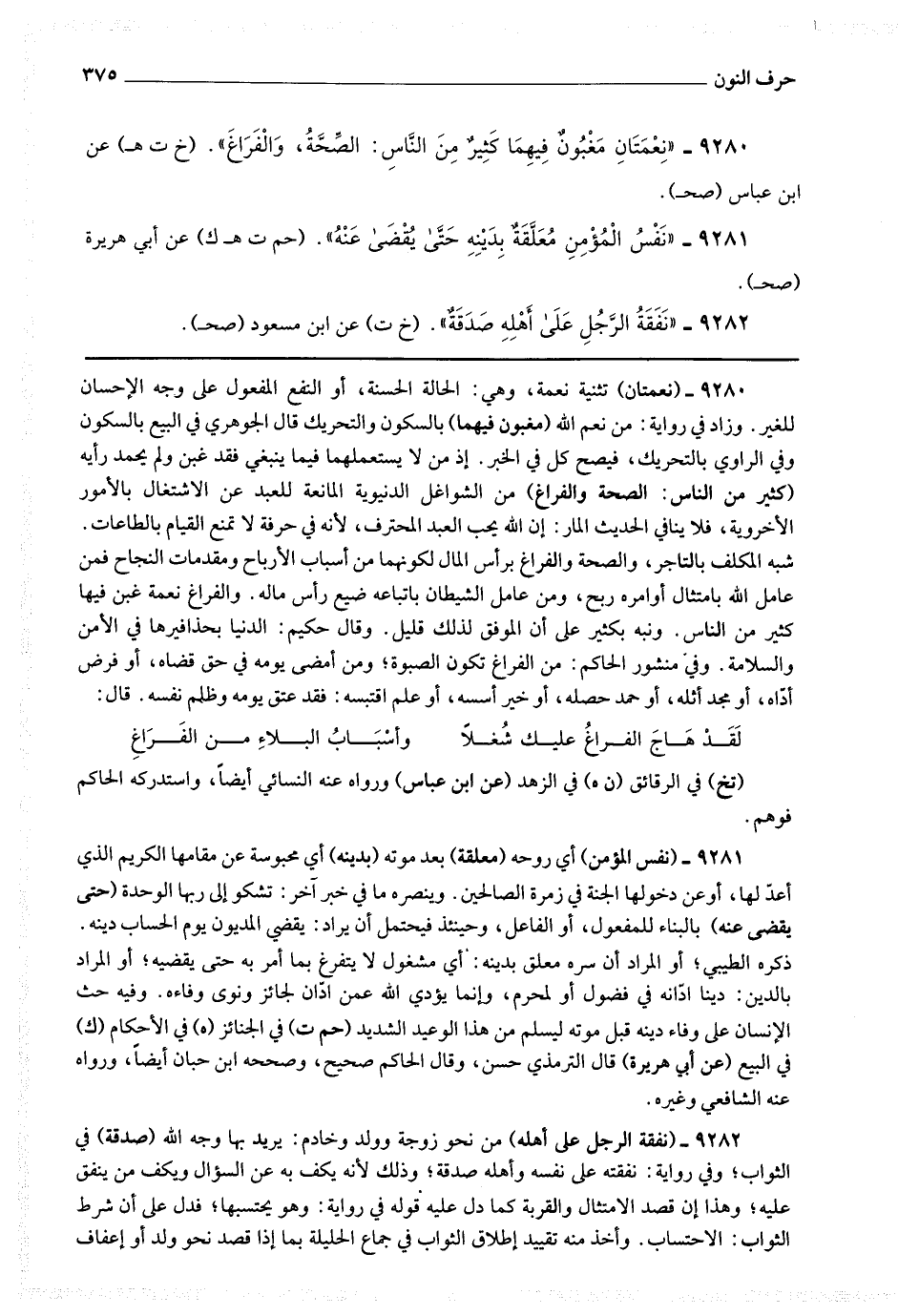 9281 - (نفس المؤمن) أي روحه (معلقة) بعد موته (بدينه) أي محبوسة عن مقامها الكريم الذي أعد لها ، أو عن [ ص 289 ] دخولها الجنة في زمرة الصالحين.