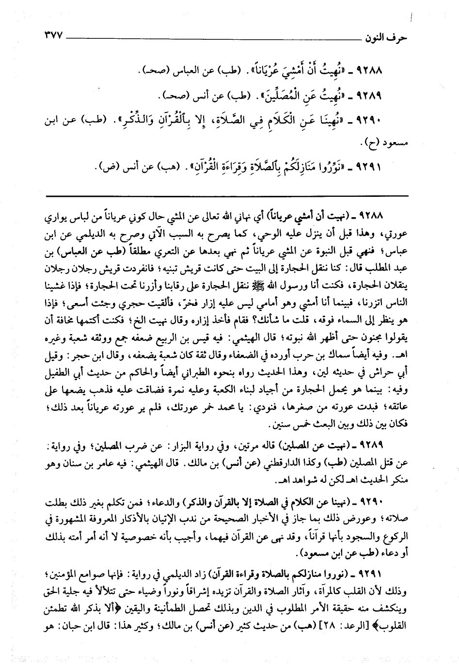 - (طب عن العباس) بن عبد المطلب قال : كنا ننقل الحجارة إلى البيت حين كانت قريش تبنيه ، فانفردت قريش رجلان رجلان ينقلان الحجارة ، فكنت أنا ورسول الله صلى الله عليه وسلم ننقل الحجارة على رقابنا وأزرنا تحت الحجارة ، فإذا غشينا الناس اتزرنا ، فبينما أنا أمشي وهو أمامي ليس عليه إزار فخر ، فألقيت حجري وجئت أسعى ، فإذا هو ينظر إلى السماء فوقه ، قلت ما شأنك ؟ فقام فأخذ إزاره وقال نهيت إلخ ، فكنت أكتمها مخافة أن يقولوا مجنون حتى أظهر الله نبوته ، قال الهيثمي : فيه قيس بن الربيع ضعفه جمع ووثقه شعبة وغيره
