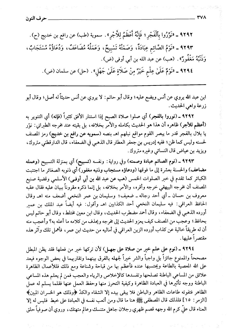 9294 - (نوم على علم خير من صلاة على جهل) لأن تركها خير من فعلها فقد يظن المبطل مصححا والممنوع جائزا بل واجبا والشر خيرا لجهله بالفرق بينهما وتقاربهما في بعض الوجوه فيعد على الله المعصية بالطاعة ويحتسبها عنده فأعظم بها من قباحة وشناعة ومع ذلك فللأعمال الظاهرة علائق من المساعي الباطنة تصلحها وتفسدها كالإخلاص والرياء والعجب فمن لم يعلم هذه المساعي الباطنة ووجه تأثيرها في العبادة الظاهرة وكيفية التحرز منها وحفظ العمل عنها فقلما يسلم له عمل الظاهر فتفوته طاعات الظاهر والباطن فلا يبقى بيده إلا الشقاء والكد * (وذلك هو الخسران المبين) * [ الزمر : 15 ] فلذلك قال المصطفى صلى الله عليه وسلم هنا ما قال ومن أتعب نفسه في العبادة على خبط فليس له إلا العناء قال علي كرم الله وجهه قصم ظهري رجلان جاهل متنسك وعالم متهتك ، وروي أن صوفيا حلق