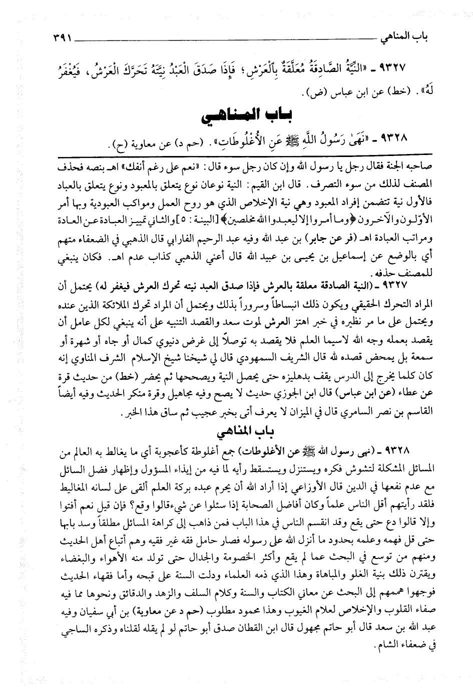 9328 - (نهى رسول الله صلى الله عليه وسلم عن الأغلوطات) جمع أغلوطة كأعجوبة أي ما يغالط به العالم من المسائل المشكلة لتشوش فكره ويستنزل ويستسقط رأيه لما فيه من إيذاء المسؤول وإظهار فضل السائل مع عدم نفعها في الدين قال الأوزاعي: إذا أراد الله أن يحرم عبده بركة العلم ألقى على لسانه المغاليط فلقد رأيتهم أقل الناس علما وكان أفاضل الصحابة إذا سئلوا عن شئ قالوا: وقع؟ فإقيل نعم أفتوا وإلا قالوا دع حتى يقع، وقد انقسم الناس في هذا الباب فمن ذاهب إلى كراهة المسائل مطلقا وسد بابها حتى قل فهمه وعلمه بحدود ما أنزل الله على رسوله فصار حامل فقه غير فقيه وهم أتباع أهل الحديث ومنهم من توسع في البحث عما لم يقع وأكثر الخصومة والجدال حتى تولد منه الأهواء والبغضاء ويقترن ذلك بنية الغلو والمباهاة وهذا الذي ذمه العلماء ودلت السنة على قبحه وأما فقهاء الحديث فوجهوا هممهم إلى البحث عن معاني الكتاب والسنة وكلام السلف والزهد والدقائق ونحوها مما فيه صفاء القلوب والإخلاص لعلام الغيوب وهذا محمود مطلوب (حم د عن معاوية) بن أبي سفيان، وفيه عبد الله بن سعد قال أبو حاتم: مجهول قال [ص 302] ابن القطان: صدق أبو حاتم لو لم يقله لقلناه وذكره الساجي في ضعفاء الشام.