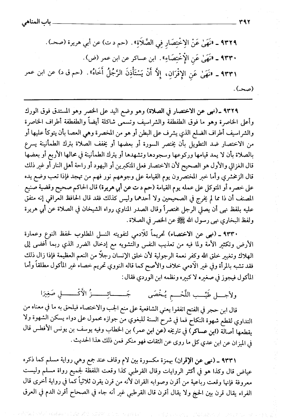 9329 - (نهى عن الاختصار في الصلاة) وهو وضع اليد على الخصر وهو المستدق فوق الورك وأعلى الخاصرة وهو ما فوق الطفطفة والشراسيف وتسمى شاكلة أيضا والطفطفة أطراف الخاصرة والشراسيف أطراف الضلع الذي يشرف على البطن أو هو من المخصرة وهي العصا بأن يتوكأ عليها أو من الاختصار ضد التطويل بأن يختصر السورة أو بعضها أو يخفف الصلاة بترك الطمأنينة يسرع بالصلاة بأن لا يمد قيامها وركوعها وسجودها وتشهدها أو يترك الطمأنينة في محالها الأربع أو بعضها