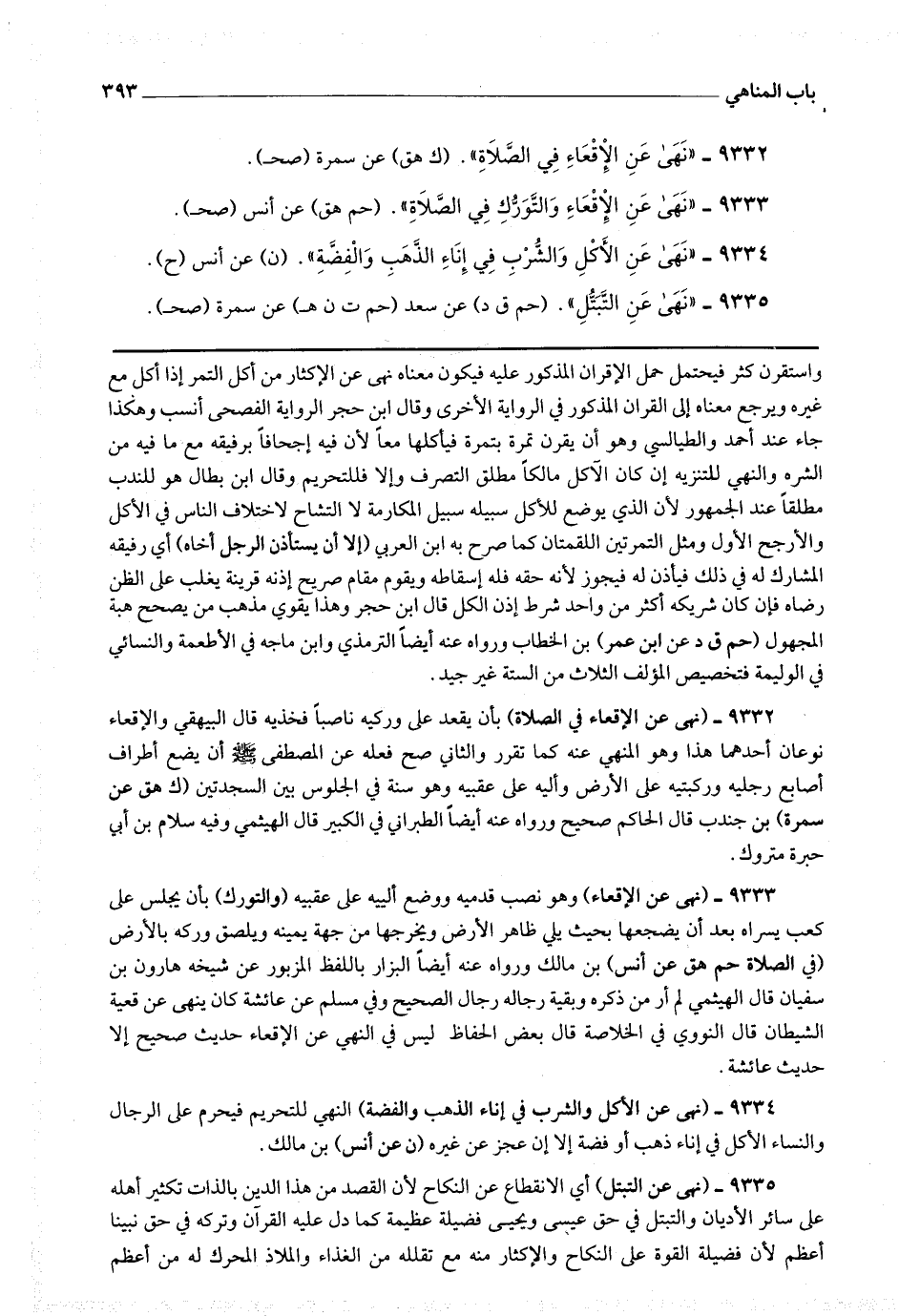9333 - (نهى عن الإقعاء) وهو نصب قدميه ووضع ألييه على عقبيه (والتورك) بأن يجلس على كعب يسراه بعد أن يضجعها بحيث يلي ظاهر الأرض ويخرجها من جهة يمينه ويلصق وركه بالأرض (في الصلاة) (حم هق عن أنس) بن مالك ورواه عنه أيضا البزار باللفظ المزبور عن شيخه هارون بن سفيان قال الهيثمي : لم أر من ذكره وبقية رجاله رجال الصحيح وفي مسلم عن عائشة كان ينهى عن قعية الشيطان قال النووي في الخلاصة : قال بعض الحفاظ : ليس في النهي عن الإقعاء حديث صحيح إلا حديث عائشة.
