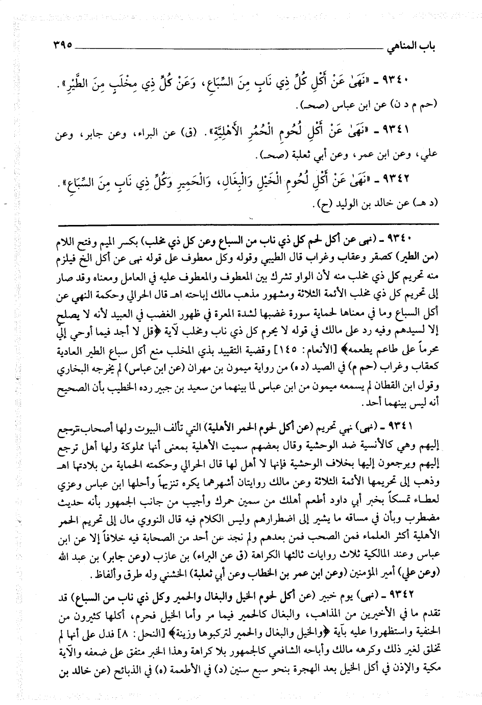 9342 - (نهى) يوم خيبر (عن أكل لحوم الخيل والبغال والحمير وكل ذي ناب من السباع) قد تقدم ما في الأخيرين من المذاهب ، والبغال كالحمير فيما مر ، وأما الخيل فحرم أكلها كثيرون من الحنفية واستظهروا عليه بآية * (والخيل والبغال والحمير لتركبوها وزينة) * فدل على أنها لم تخلق لغير ذلك وكرهه مالك وأباحه الشافعي كالجمهور بلا كراهة ، وهذا الخبر متفق على ضعفه والآية مكية والإذن في أكل الخيل بعد الهجرة بنحو سبع سنين (د) في الأطعمة (ه) في الذبائح (عن خالد بن