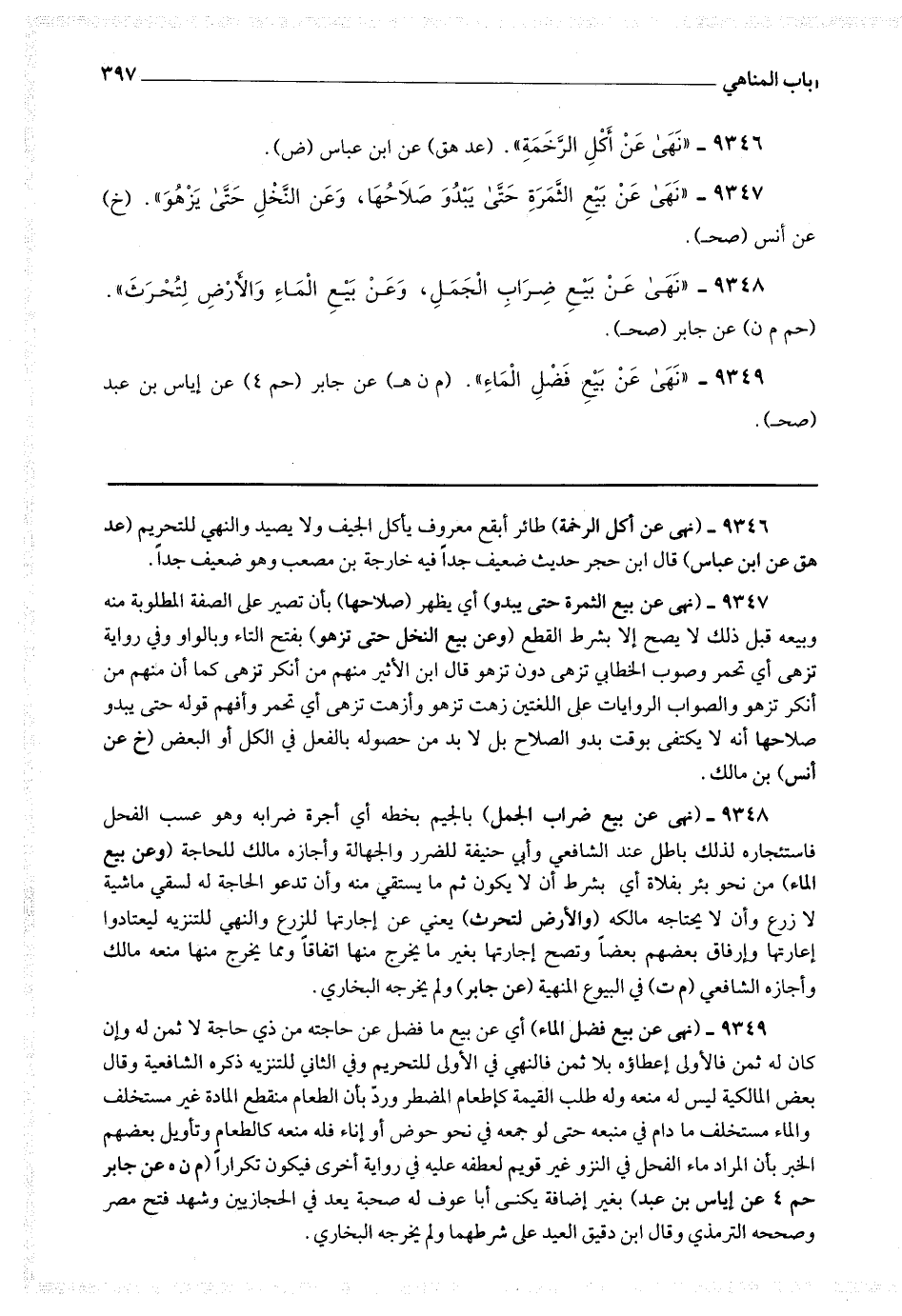 9347 - (نهى عن بيع الثمرة حتى يبدو) أي يظهر (صلاحها) بأن تصير على الصفة المطلوبة منه وبيعه قبل ذلك لا يصح إلا بشرط القطع (وعن بيع النخل حتى تزهو) بفتح التاء وبالواو وفي رواية تزهى أي تحمر ، وصوب الخطابي تزهى دون تزهو قال ابن الأثير : منهم من أنكر نزهى كما أن منهم من أنكر تزهو والصواب الروايات على اللغتين زهت تزهو وأزهت تزهى أي تحمر ، وأفهم قوله حتى يبدو صلاحها أنه لا يكتفي بوقت بدو الصلاح بل لا بد من حصوله بالفعل في الكل أو البعض (خ عن