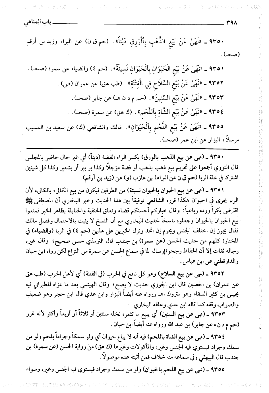 9351 - (نهى عن بيع الحيوان بالحيوان نسيئة) من الطرفين فيكون من بيع الكالئ بالكالئ لأن الربا يجري في الحيوان هكذا قرره الشافعي توفيقا بين هذا الحديث وخبر البخاري أن المصطفى صلى الله عليه وسلم اقترض بكرا ورده رباعيا وقال : خياركم أحسنكم قضاءا ، وتعلق الحنفية والحنابلة بظاهر الخبر فمنعوا بيع الحيوان بالحيوان وجعلوه ناسخا لحديث البخاري مع أن النسخ لا يثبت بالاحتمال ، وفصل مالك