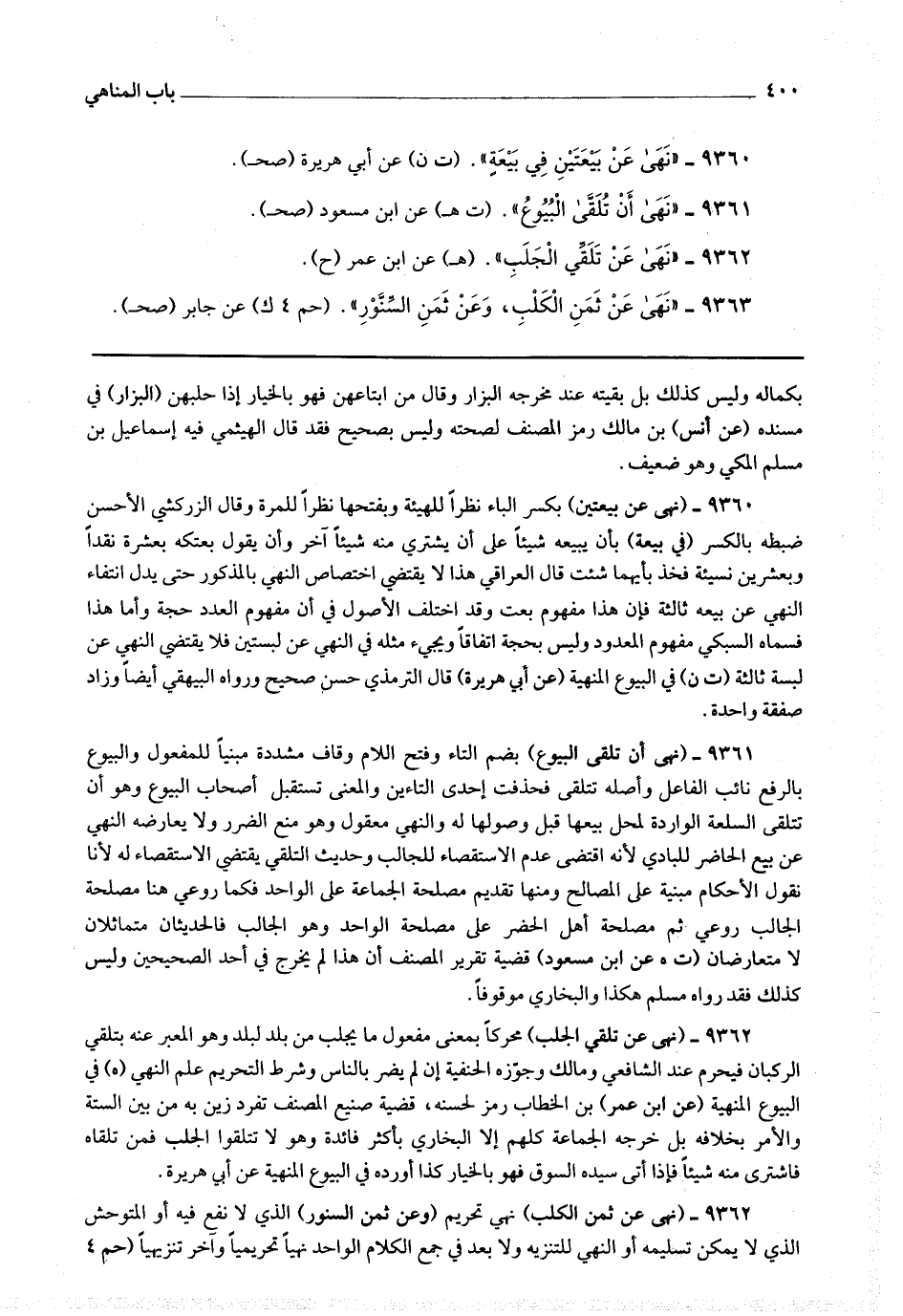 9361 - (نهى أن تلقى البيوع) بضم التاء وفتح اللام وقاف مشددة مبنيا للمفعول والبيوع بالرفع نائب الفاعل وأصله تتلقى فحذفت إحدى التاءين والمعنى تستقبل أصحاب البيوع وهو أن تتلقى السلعة الواردة لمحل بيعها قبل وصولها له والنهي معقول وهو منع الضرر ولا يعارضه النهي عن بيع الحاضر للبادي لأنه اقتضى عدم الاستقصاء للجالب وحديث التلقي يقتضي الاستقصاء له لأنا نقول الأحكام مبنية على المصالح ومنها تقديم مصلحة الجماعة على الواحد فكما روعي هنا مصلحة الجالب روعي ثم مصلحة أهل الحضر على مصلحة الواحد وهو الجالب فالحديثان متماثلان لا متعارضان (ت ه عن ابن مسعود) قضية تقرير المصنف أن هذا لم يخرج في أحد الصحيحين وليس كذلك فقد رواه مسلم هكذا والبخاري موقوفا.