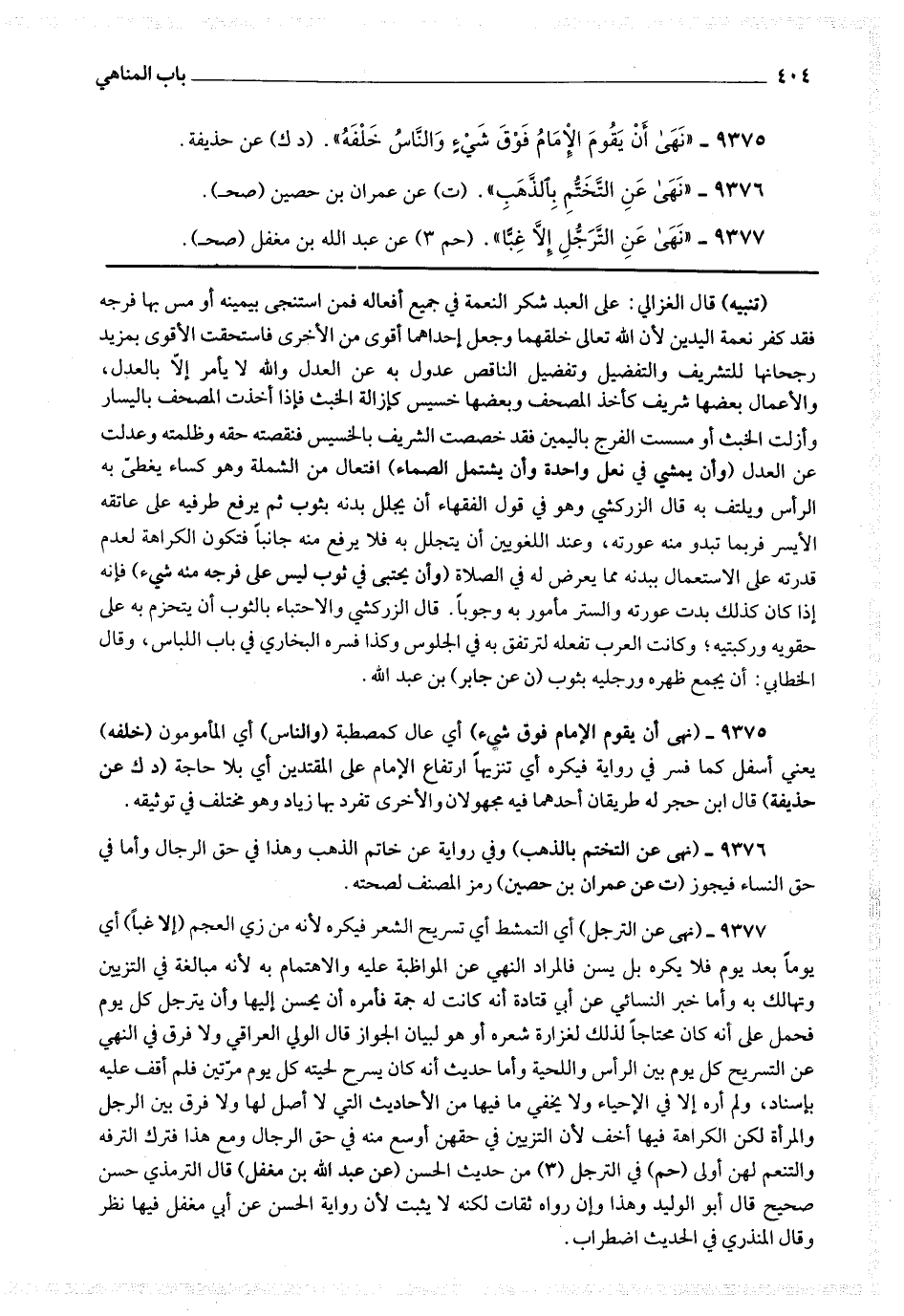 9377 - (نهى عن الترجل) أي التمشط أي تسريح الشعر فيكره لأنه من زي العجم (إلاغبا) أي يوما بعد يوم فلا يكره بل يسن فالمراد النهي عن المواظبة عليه والاهتمام به لأنه مبالغة في التزيين وتهالك به وأما خبر النسائي عن أبي قتادة أنه كانت [ ص 312 ] له جمة فأمره أن يحسن إليها وأن يترجل كل يوم فحمل على أنه كان محتاجا لذلك لغزارة شعره أو هو لبيان الجواز قال الولي العراقي : ولا فرق في النهي عن التسريح كل يوم بين الرأس واللحية وأما حديث أنه كان يسرح لحيته كل يوم مرتين فلم أقف عليه بإسناد ، ولم أره إلا في الإحياء ولا يخفى ما فيها من الأحاديث التي لا أصل لها ولا فرق بين الرجل والمرأة لكن الكراهة فيها أخف لأن التزيين في حقهن أوسع منه في حق الرجال ومع هذا فترك الترفه والتنعم لهن أولى (حم) في الترجل (3) من حديث الحسن (عن عبد الله بن مغفل) قال الترمذي : حسن صحيح قال أبو الوليد : وهذا وإن رواه ثقات لكنه لا يثبت لأن رواية الحسن عن أبي مغفل فيها نظر وقال المنذري : في الحديث اضطراب.