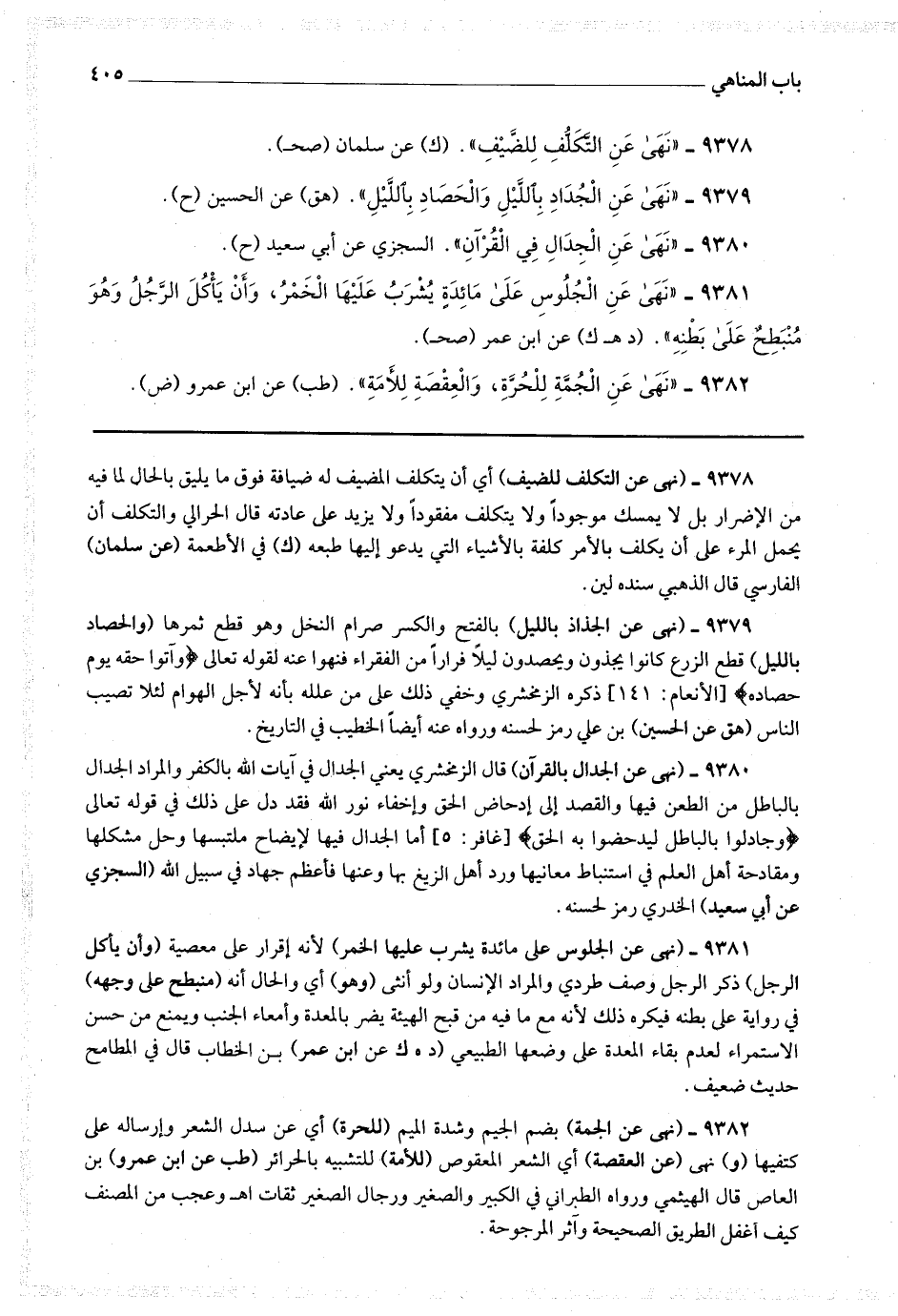 9379 - (نهى عن الجذاذ بالليل) بالفتح والكسر صرام النخل وهو قطع ثمرها (والحصاد بالليل) قطع الزرع كانوا يجذون ويحصدون ليلا فرارا من الفقراء فنهوا عنه لقوله تعالى * (وآتوا حقه يوم حصاده) * ذكره الزمخشري وخفي ذلك على من علله بأنه لأجل الهوام لئلا تصيب