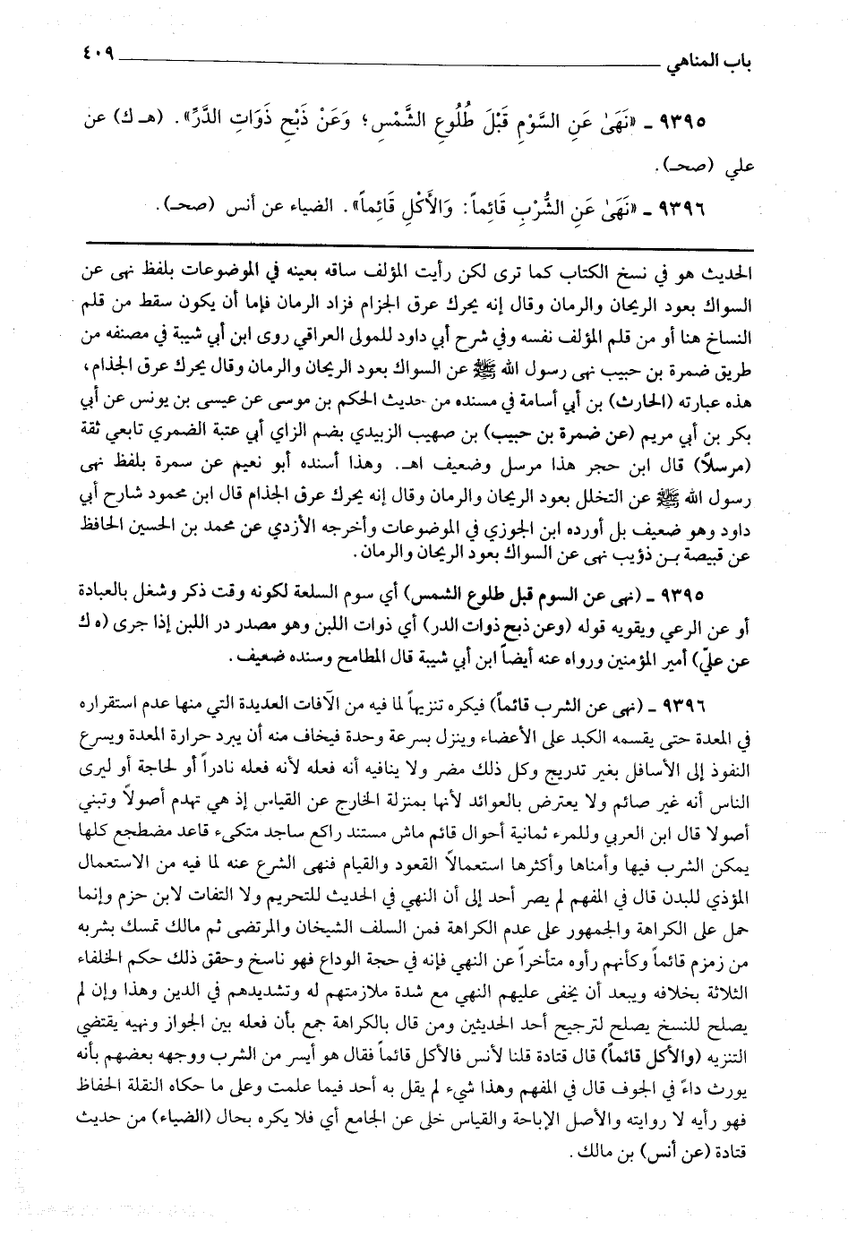 9396 - (نهى عن الشرب قائما) فيكره تنزيها لما فيه من الآفات العديدة التي منها عدم استقراره في المعدة حتى يقسمه [ ص 316 ] الكبد على الأعضاء وينزل بسرعة وحده فيخاف منه أن يبرد حرارة المعدة ويسرع