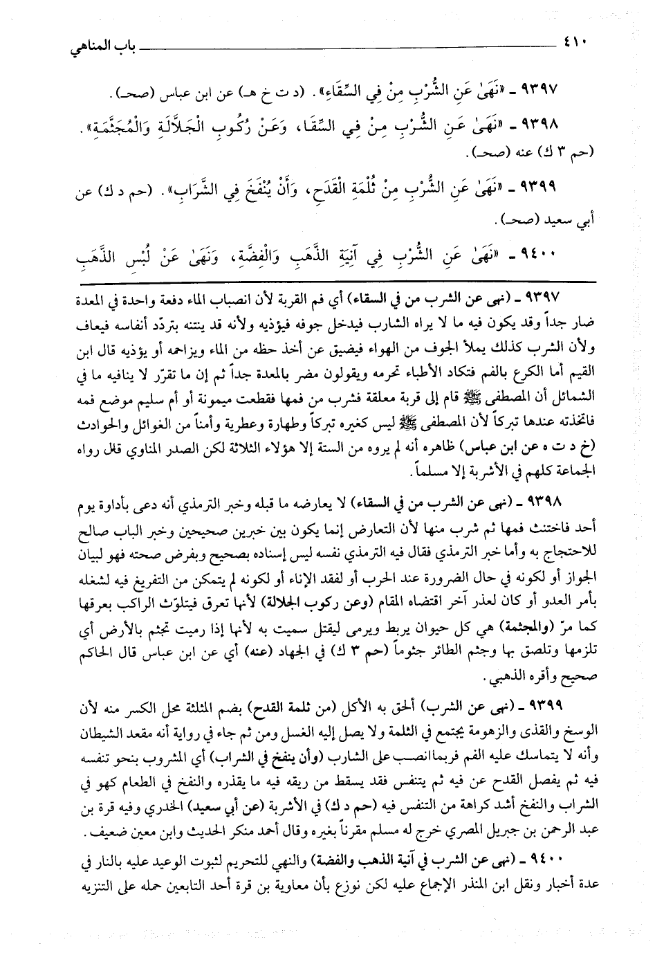 9400 - (نهى عن الشرب في آنية الذهب والفضة) والنهي للتحريم لثبوت الوعيد عليه بالنار في عدة أخبار ونقل ابن المنذر الإجماع عليه لكن نوزع بأن معاوية بن قرة أحد التابعين حمله على التنزيه