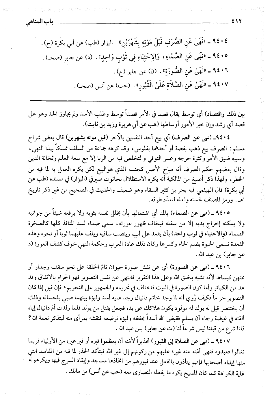 9405 - (نهى عن الصماء) بالمد أي اشتمالها بأن يخلل نفسه بثوبه ولا يرفعه شيئا من جوانبه ولا يمكنه إخراج يديه إلا من سفله فيخاف ظهور عورته سمى صماء لسد المنافذ كلها كالصخرة الصماء (والاحتباء في ثوب واحد) بأن يقعد على ألييه وينصب ساقيه ويلف عليهما ثوبا أو نحوه وهذه القعدة تسمى الحبوة بضم الحاء وكسرها وكان ذلك عادة العرب وحكمة النهي خوف كشف العورة (د عن جابر) بن عبد الله.