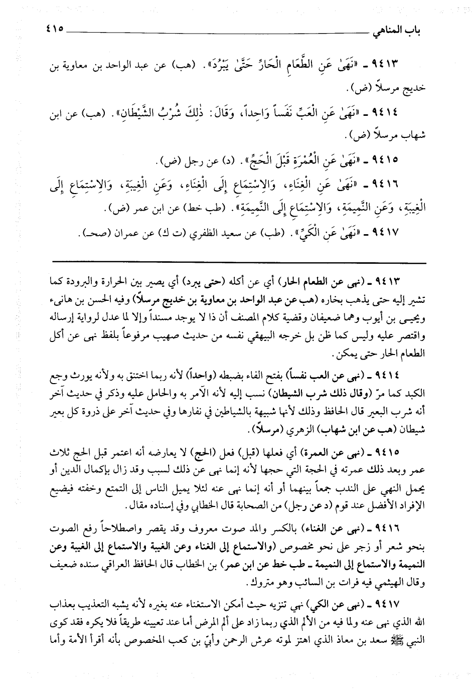 9413 - (نهى عن الطعام الحار) أي عن أكله (حتى يبرد) أي يصير بين الحرارة والبرودة كما تشير إليه حتى يذهب بخاره (هب عن عبد الواحد بن معاوية بن خديج مرسلا) وفيه الحسن بن هانئ ويحيى بن أيوب وهما ضعيفان وقضية كلام المصنف أن ذا لا يوجد مسندا وإلا لما عدل لرواية إرساله واقتصر عليه وليس كما ظن بل خرجه البيهقي نفسه من حديث صهيب مرفوعا بلفظ نهى عن أكل الطعام الحار حتى يمكن.