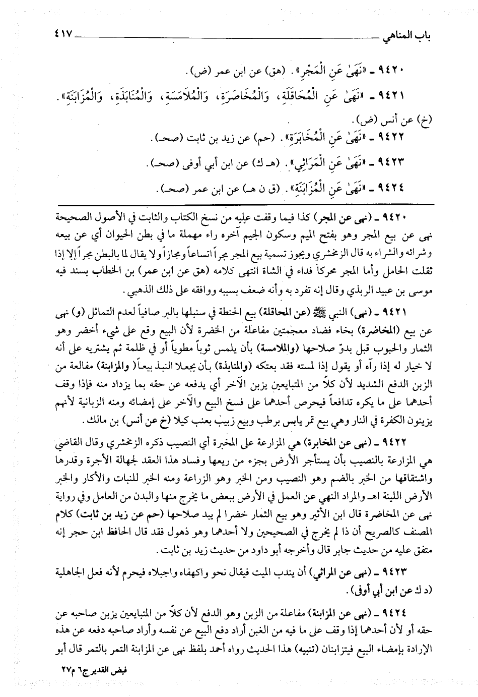 9420 - (نهى عن المجر) كذا فيما وقفت عليه من نسخ الكتاب والثابت في الأصول الصحيحة نهى عن بيع المجر وهو بفتح الميم وسكون الجيم آخره راء مهملة ما في بطن الحيوان أي عن بيعه