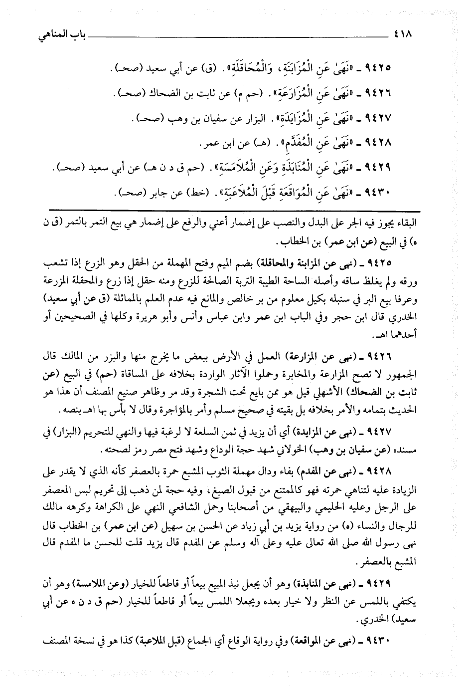 9425 - (نهى عن المزابنة والمحاقلة) بضم الميم وفتح المهملة من الحقل وهو الزرع إذا تشعب ورقه ولم يغلظ ساقه وأصله الساحة الطيبة التربة الصالحة للزرع ومنه حقل إذا زرع والمحقلة المزرعة وعرفا بيع البر في سنبله بكيل معلوم من بر خالص والمانع فيه عدم العلم بالمماثلة (ق عن أبي سعيد) الخدري قال ابن حجر : وفي الباب ابن عمر وابن عباس وأنس وأبو هريرة وكلها في الصحيحين أو أحدهما اه.
