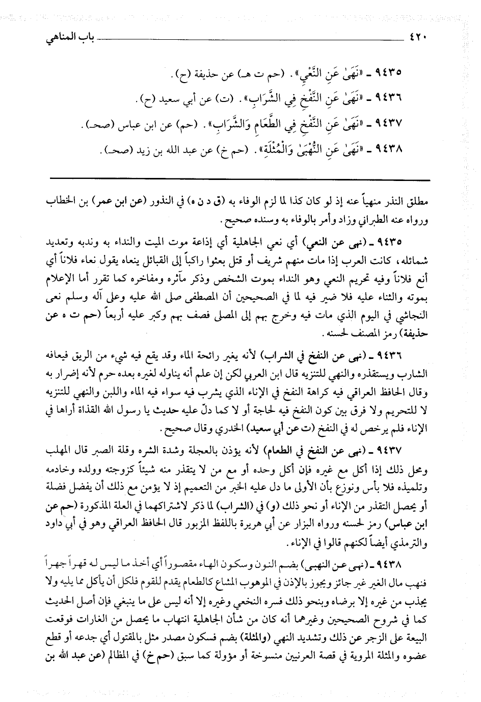 9435 - (نهى عن النعي) أي نعي الجاهلية أي إذاعة موت الميت والنداء به وندبه وتعديد شمائله ، كانت العرب إذا مات منهم شريف أو قتل بعثوا راكبا إلى القبائل ينعاه يقول نعاء فلانا أي أنع فلانا وفيه تحريم النعي وهو النداء بموت الشخص وذكر مآثره ومفاخره كما تقرر أما الإعلام بموته والثناء عليه فلا ضير فيه لما في الصحيحين أن المصطفى صلى الله عليه وعلى آله وسلم نعى النجاشي في اليوم الذي مات فيه وخرج بهم إلى المصلى فصف بهم وكبر عليه أربعا (حم ت ه عن حذيفة) رمز المصنف لحسنه.