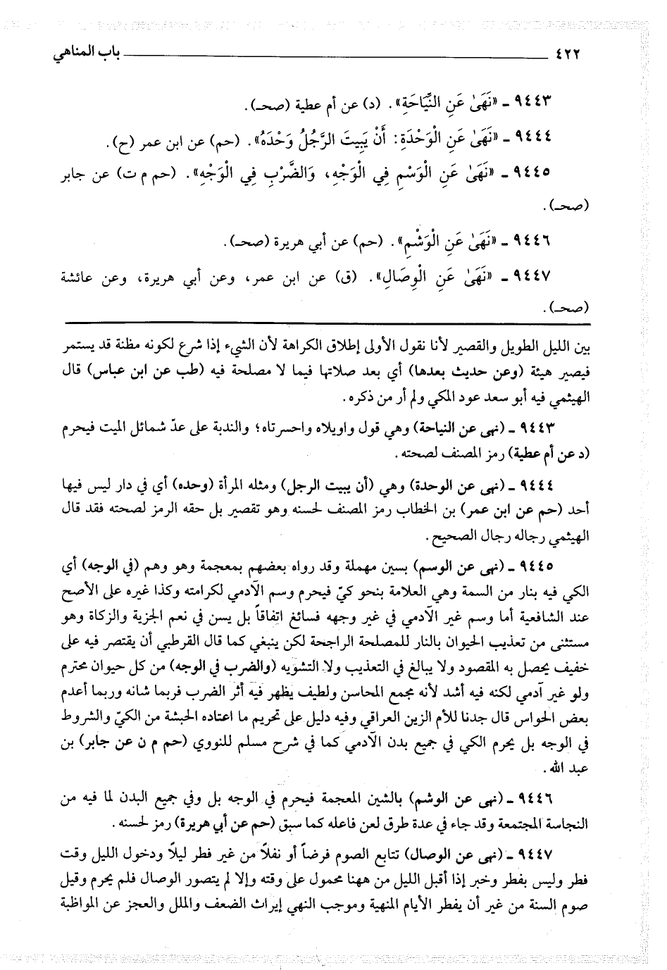 9446 - (نهى عن الوشم) بالشين المعجمة فيحرم في الوجه بل وفي جميع البدن لما فيه من النجاسة المجتمعة وقد جاء في عدة طرق لعن فاعله كما سبق (حم عن أبي هريرة) رمز لحسنه.