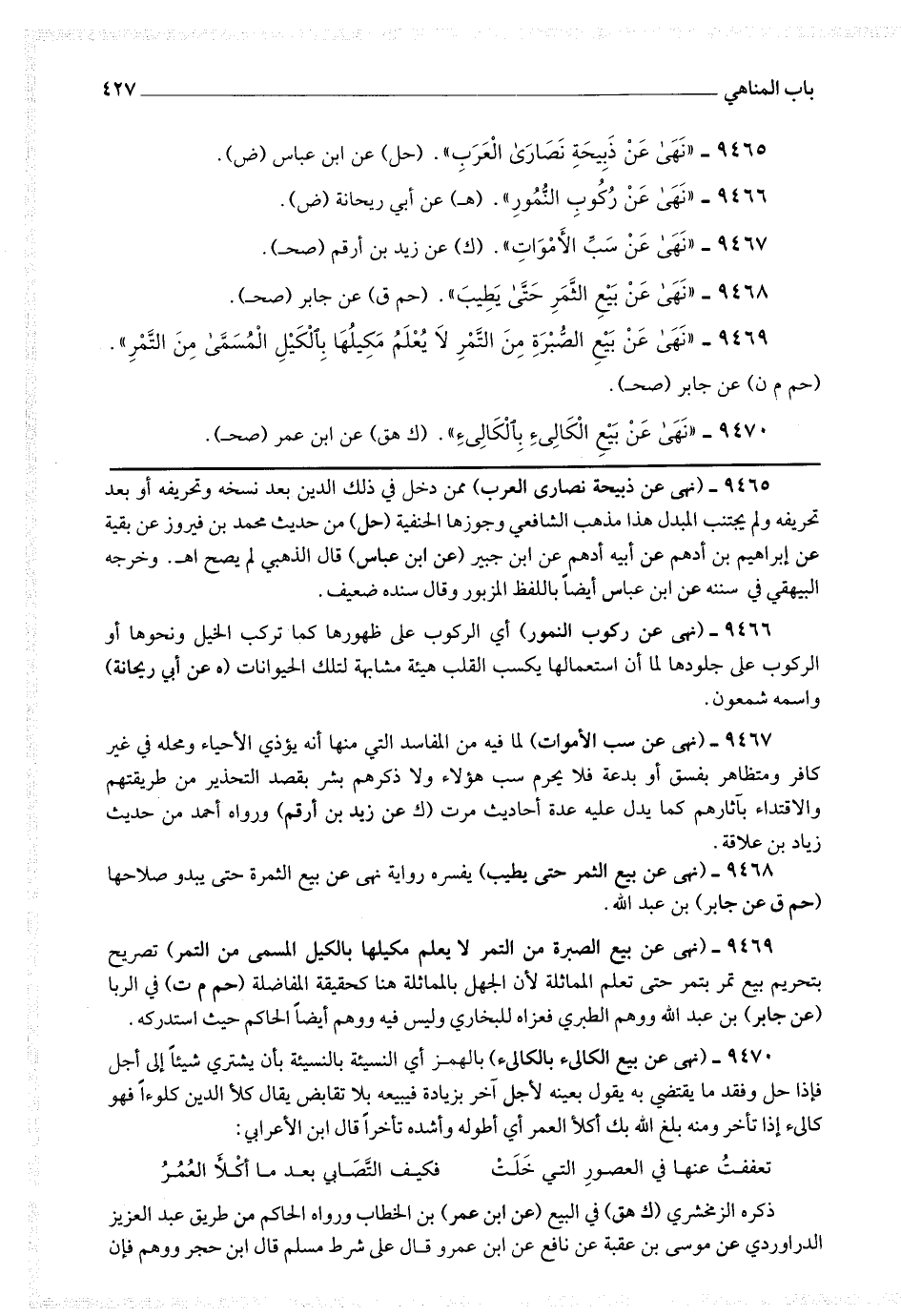 9466 - (نهى عن ركوب النمور) أي الركوب على ظهورها كما تركب الخيل ونحوها أو الركوب على جلودها لما مر أن استعمالها يكسب القلب هيئة مشابهة لتلك الحيوانات (ه عن أبي ريحانة) واسمه شمعون.