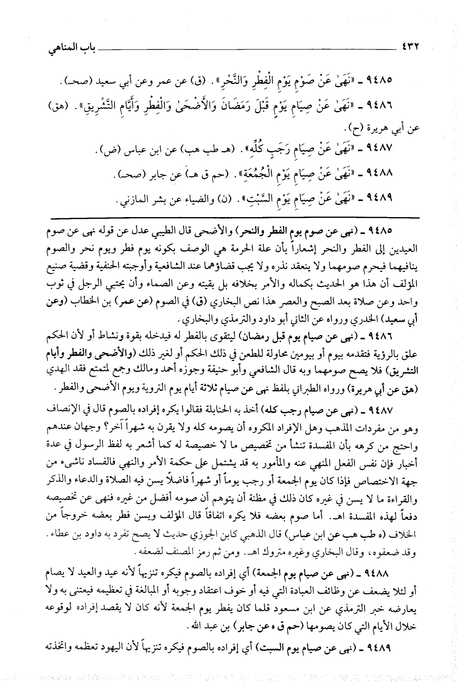 9487 - (نهى عن صيام رجب كله) أخذ به الحنابلة فقالوا : يكره إفراده بالصوم قال في الإنصاف : وهو من مفردات المذهب [ ص 334 ] وهل الإفراد المكروه أن يصومه كله ولا يقرن به شهرا آخر ؟ وجهان عندهم واحتج من كرهه بأن المفسدة تنشأ من تخصيص ما لا خصيصة له كما أشعر به لفظ الرسول في عدة أخبار فإن نفس الفعل المنهي عنه والمأمور به قد يشتمل على حكمة الأمر والنهي فالفساد ناشئ من جهة الاختصاص فإذا كان يوم الجمعة أو رجب يوما أو شهرا فاضلا يسن فيه الصلاة والدعاء والذكر والقراءة ما لا يسن في غيره كان ذلك في مظنة أن يتوهم أن صومه أفضل من غيره فنهى عن تخصيصه دفعا لهذه المفسدة اه.