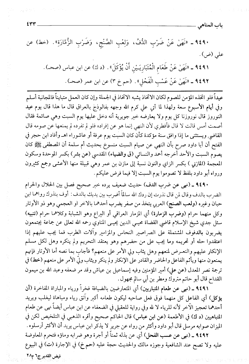 9490 - (نهى عن ضرب الدف) حديث ضعيف يرده خبر صحيح فصل بين الحلال والحرام الضرب بالدف وقال لمن قال نذرت إن ردك الله سالما أضرب بين يديك بالدف أوف بنذرك رواهما ابن حبان وغيره (ولعب الصنج) العربي يتخذ من صفر يضرب أحدهما بالآخر أو العجمي وهو ذو الأوتار وكل منهما حرام و (ضرب الزمارة) أي المزمار العراقي أو اليراع وهو الشبابة وكلاهما حرام (تنبيه) سئل جدي شيخ الإسلام قاضي القضاة محيي الدين يحيى المناوي رحمه الله تعالى عن جماعة يجتمعون يضربون بالدفوف المشتملة على الصراصير النحاس والمزامير وآلات الطرب فما يجب عليهم إذا اعتقدوا حله أو تحريمه وما يجب على من حضرهم وهو يعتقد التحريم ولم ينكره وهل لكل مسلم