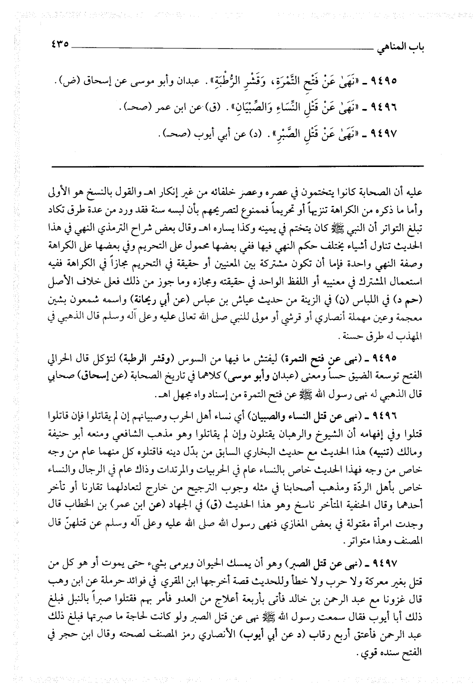 9496 - (نهى عن قتل النساء والصبيان) أي نساء أهل الحرب وصبيانهم إن لم يقاتلوا فإن قاتلوا قتلوا وفي إفهامه أن الشيوخ والرهبان يقتلون وإن لم يقاتلوا وهو مذهب الشافعي ومنعه أبو حنيفة ومالك (تنبيه) هذا الحديث مع حديث البخاري السابق من بدل دينه فاقتلوه كل منهما عام من وجه خاص من وجه فهذا الحديث خاص بالنساء عام في الحربيات والمرتدات وذاك عام في الرجال والنساء خاص بأهل الردة ومذهب أصحابنا في مثله وجوب الترجيح من خارج لتعادلهما تقارنا أو تأخر أحدهما وقال الحنفية : المتأخر ناسخ وهو هذا الحديث (ق) في الجهاد (عن ابن عمر) بن الخطاب قال : وجدت امرأة مقتولة في بعض المغازي فنهى رسول الله صلى الله عليه وعلى آله وسلم عن قتلهن قال المصنف : وهذا متواتر.