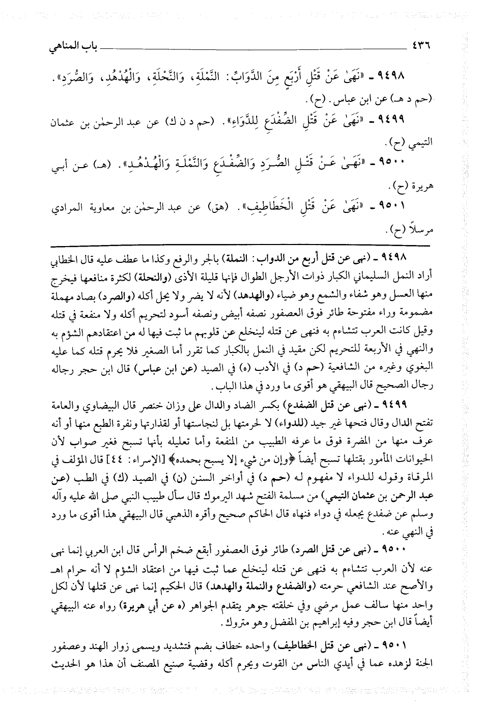 9498 - (نهى عن قتل أربع من الدواب : النملة) بالجر والرفع وكذا ما عطف عليه قال الخطابي :