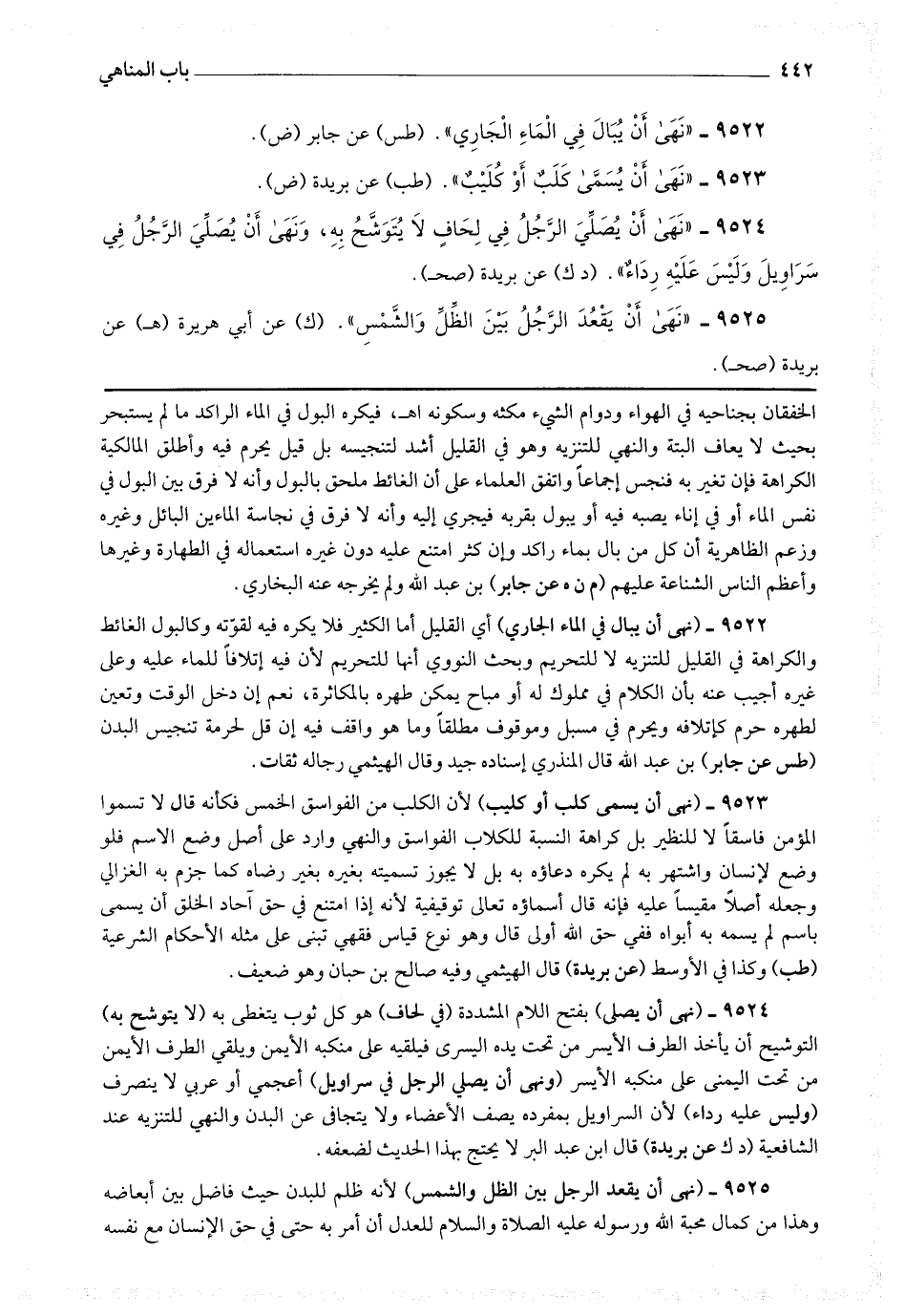9522 - (نهى أن يبال في الماء الجاري) أي القليل أما الكثير فلا يكره فيه لقوته وكالبول الغائط والكراهة في القليل للتنزيه لا للتحريم وبحث النووي أنها للتحريم لأن فيه إتلافا للماء عليه وعلى غيره أجيب عنه بأن الكلام في مملوك له أو مباح يمكن طهره بالمكاثرة ، نعم إن دخل الوقت وتعين لطهره حرم كإتلافه ويحرم في مسبل وموقوف مطلقا وما هو واقف فيه إن قل لحرمة تنجيس البدن (طس عن جابر) بن عبد الله قال المنذري : إسناده جيد ة قال الهيثمي : رجاله ثقات.
