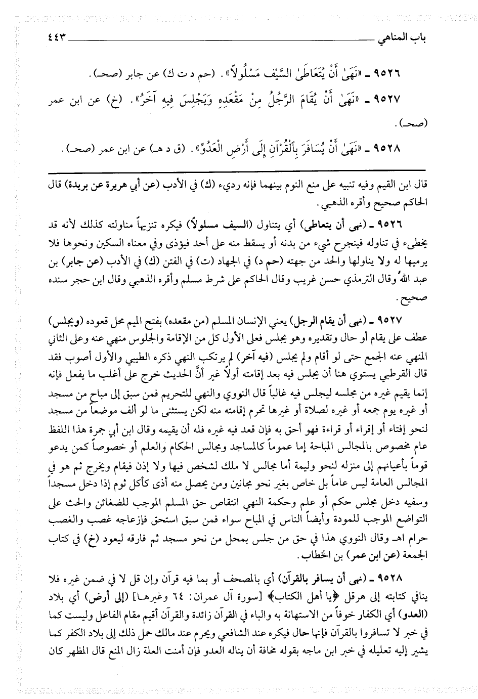 9528 - (نهى أن يسافر بالقرآن) أي بالمصحف أو بما فيه قرآن وإن قل لا في ضمن غيره فلا ينافي كتابته إلى هرقل * (يا أهل الكتاب) * (إلى أرض) أي بلاد (العدو) أي الكفار خوفا من الاستهانة به والباء في بالقرآن زائدة والقرآن أقيم مقام الفاعل وليست كما في خبر لا تسافروا بالقرآن فإنها حال فيكره عند الشافعي ويحرم عند مالك حمل ذلك إلى بلاد الكفر كما يشير إليه تعليله في خبر ابن ماجه بقوله مخافة أن يناله العدو فإن أمنت العلة زال المنع قال المظهر : كان