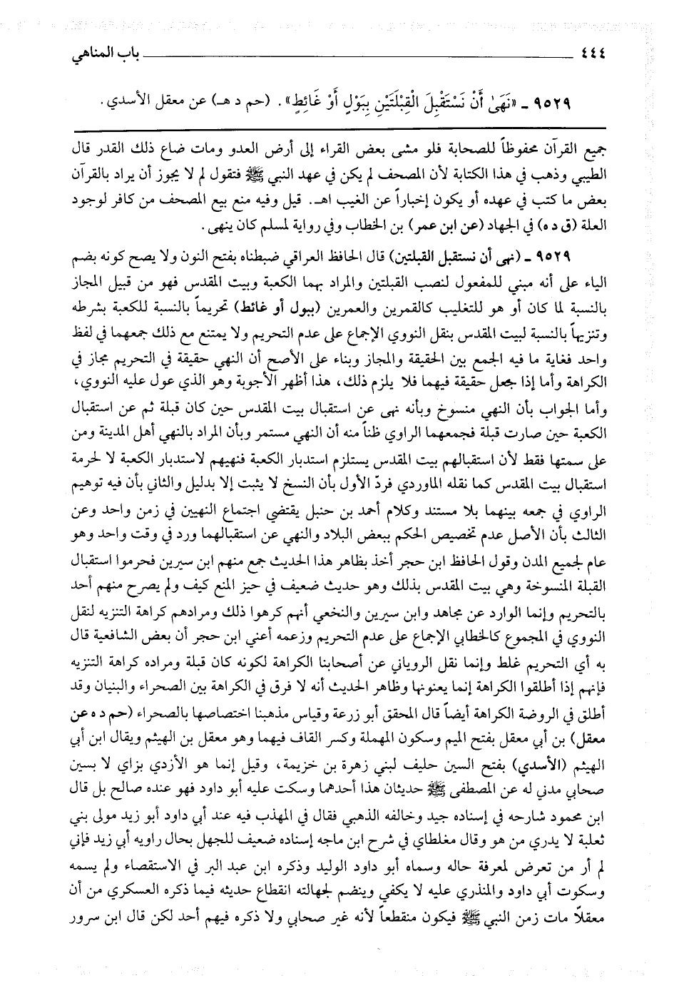 9529 - (نهى أن نستقبل القبلتين) قال الحافظ العراقي : ضبطناه بفتح النون ولا يصح كونه بضم الياء على أنه مبني للمفعول لنصب القبلتين والمراد بهما الكعبة وبيت المقدس فهو من قبيل المجاز بالنسبة لما كان أو هو للتغليب كالقمرين والعمرين (ببول أو غائط) تحريما بالنسبة للكعبة بشرطه وتنزيها بالنسبة لبيت المقدس بنقل النووي الإجماع على عدم التحريم ولا يمتنع مع ذلك جمعهما في لفظ واحد فغاية ما فيه الجمع بين الحقيقة والمجاز بناء على الأصح أن النهي حقيقة في التحريم مجاز في الكراهة وأما إذا جعل حقيقة فيهما فلا يلزم ذلك ، هذا أظهر الأجوبة وهو الذي عول عليه النووي ، وأما الجواب بأن النهي منسوخ وبأنه نهى عن استقبال بيت المقدس حين كان قبلة ثم عن استقبال الكعبة حين صارت قبلة فجمعهما الراوي ظنا منه أن النهي مستمر وبأن المراد بالنهي أهل المدينة ومن على سمتها فقط لأن استقبالهم بيت المقدس يستلزم استدبار الكعبة فنهيهم لاستدبار الكعبة لا لحرمة