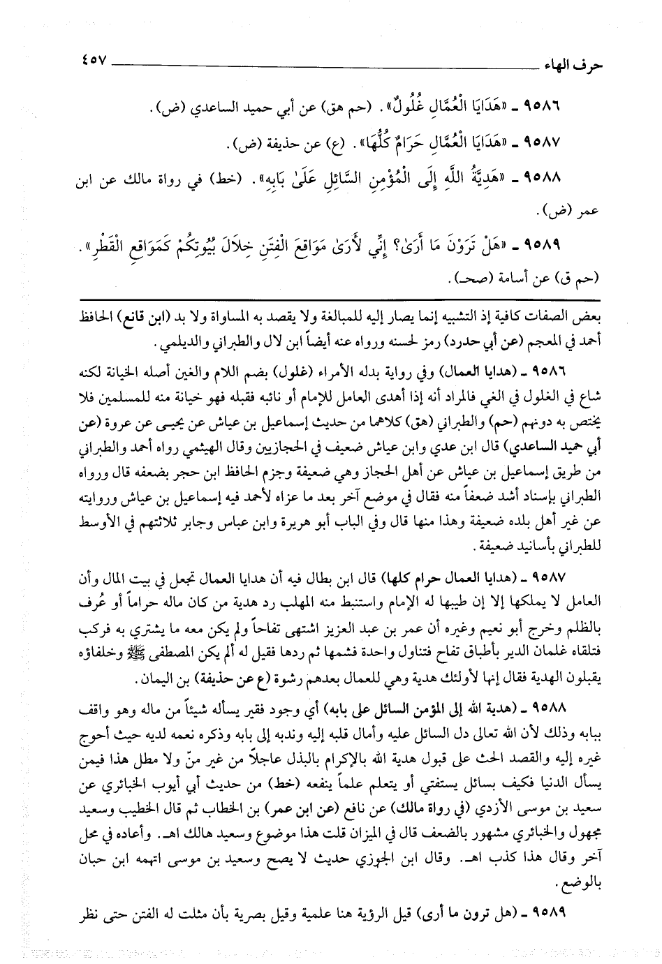 9586 - (هدايا العمال) وفي رواية بدله الأمراء (غلول) بضم اللام والغين ، أصله الخيانة لكنه شاع في الغلول في الغي فالمراد أنه إذا أهدى العامل للإمام أو نائبه فقبله فهو خيانة منه للمسلمين فلا يختص به دونهم.