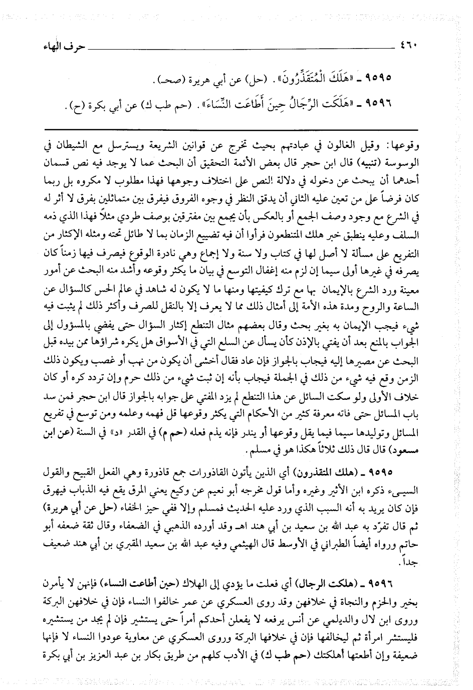 9596 - (هلكت الرجال) أي فعلت ما يؤدي إلى الهلاك (حين أطاعت النساء) فإنهن لا يأمرن بخير والحزم والنجاة في خلافهن وقد روى العسكري عن عمر خالفوا النساء فإن في خلافهن البركة وروى ابن لال والديلمي عن أنس يرفعه لا يفعلن أحدكم أمرا حتى يستشير فإن لم يجد من يستشيره فليستشر امرأة ثم ليخالفها فإن في خلافها البركة وروى العسكري عن معاوية عودوا للنساء فإنها ضعيفة وإن أطعتها أهلكتك.