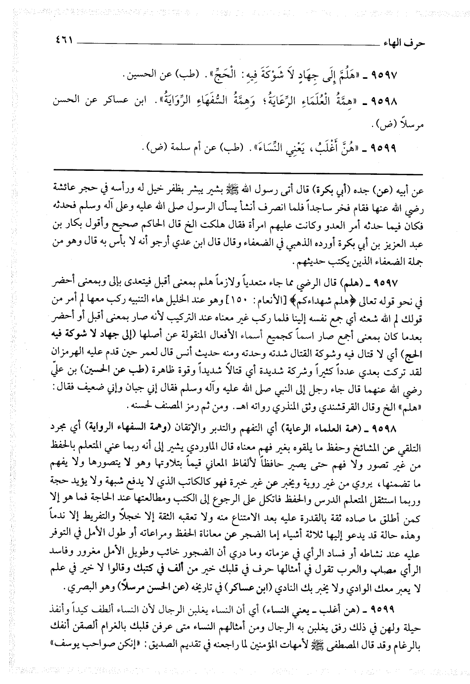 9597 - (هلم) قال الرضى مما جاء متعديا ولازما بمعنى أقبل فيتعدى بإلى وبمعنى أحضر في نحو قوله تعالى * (هلم شهداءكم) * وهو عند الخليل هاء التنبيه ركب معها لم أمر من قولك لم الله شعثه أي جمع نفسه إلينا فلما ركب غير معناه عند التركيب لأنه صار بمعنى أقبل أو أحضر بعدما كان بمعنى أجمع صار اسما كجميع أسماء الأفعال المنقولة عن أصلها (إلى جهاد لا شوكة فيه الحج) أي لا قتال فيه وشوكة القتال شدته وحدته ومنه حديث أنس قال لعمر حين قدم عليه الهرمز أن